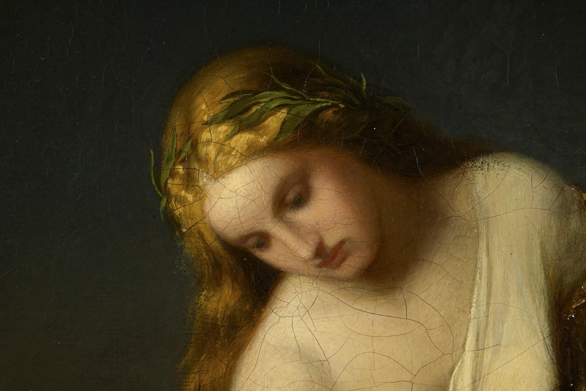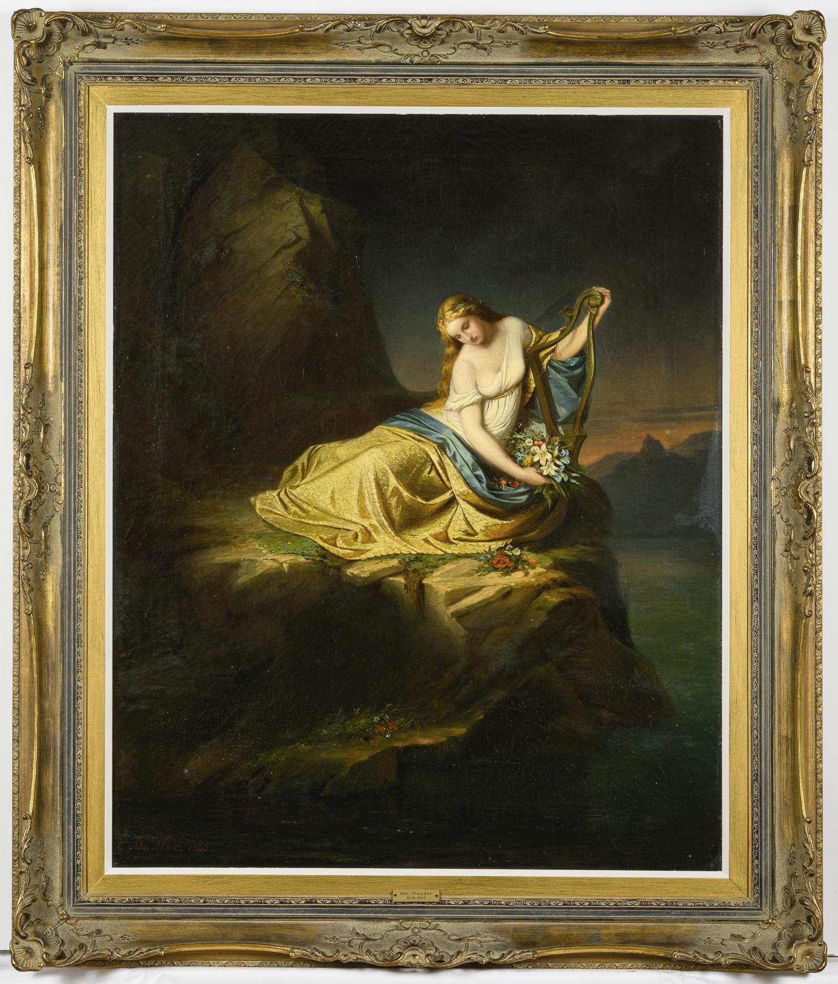 Nächtliche Szene mit junger Frau an einer Harfe mit Blumen auf einem Felsen oberhalb des Flusses. Leichte Altersspuren.