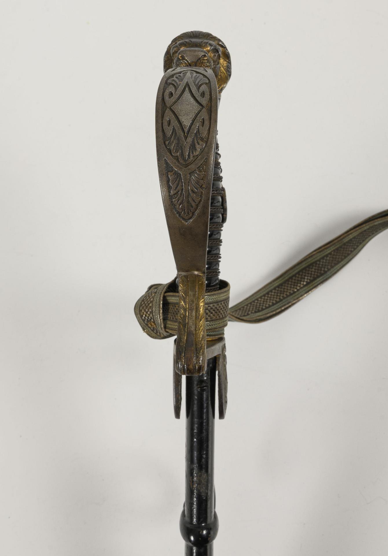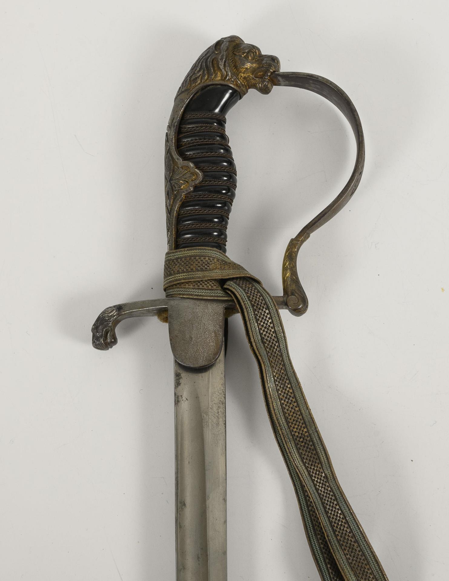 Leicht gekrümmte, einschneidige Klinge, mit breitem Hohlschliff. Eisengriff mit Resten von Vergoldung, Stichlappen mit gekreuzten Kanonen. Bakelitgriff mit etwas lockerer Drahtwicklung. Schwarze Metallscheide mit einem Tragering. / Portepee mit Silberfäden und hellblauer Kante.