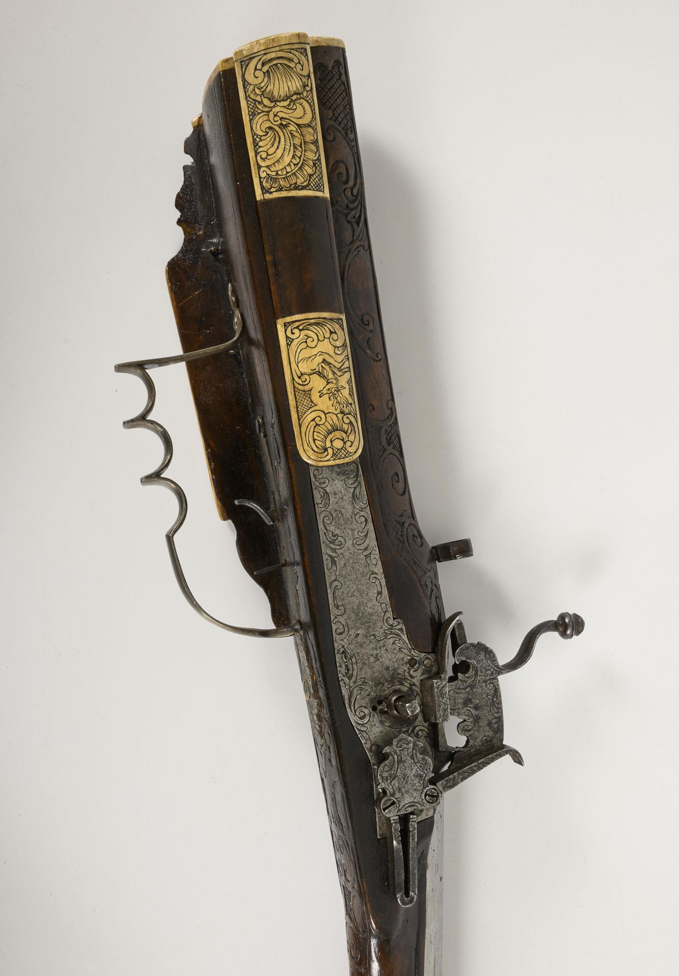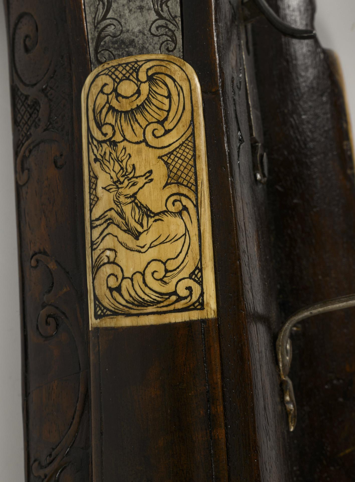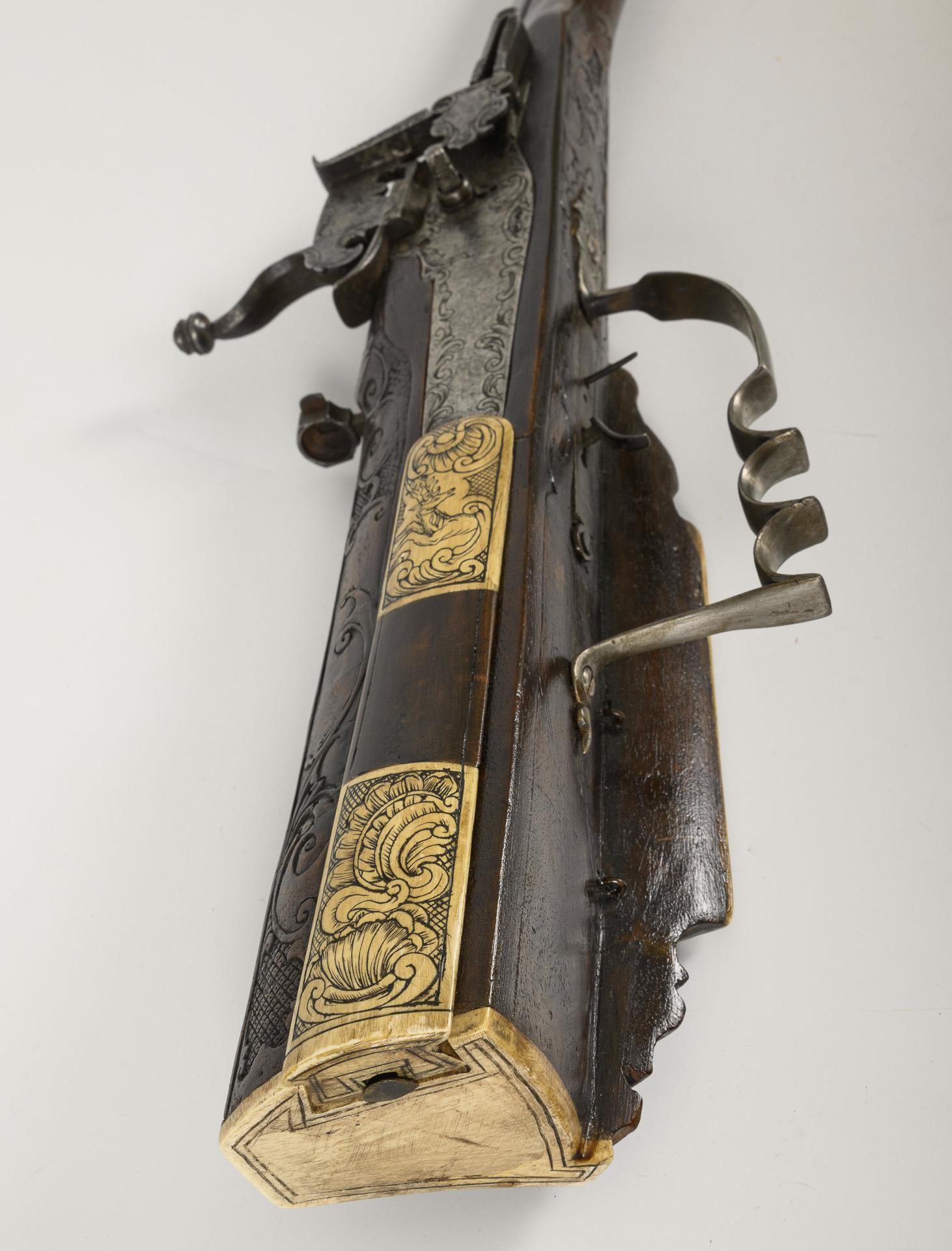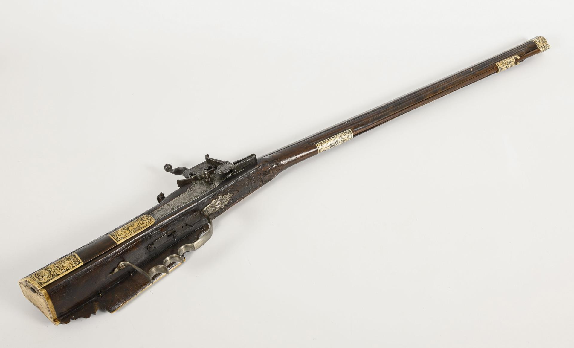 Gezogener Lauf, außen achtkantig. Dekoratives Stück mit schön gravierten Beineinlagen und ziselierten Schlossplatten, Gegenplatte aus Kupfer, funktionierendes Kolbenfach. Visiereinrichtung und verzierter Ladestock, Kolben restauriert. Restaurierter Zustand mit Ergänzungen.