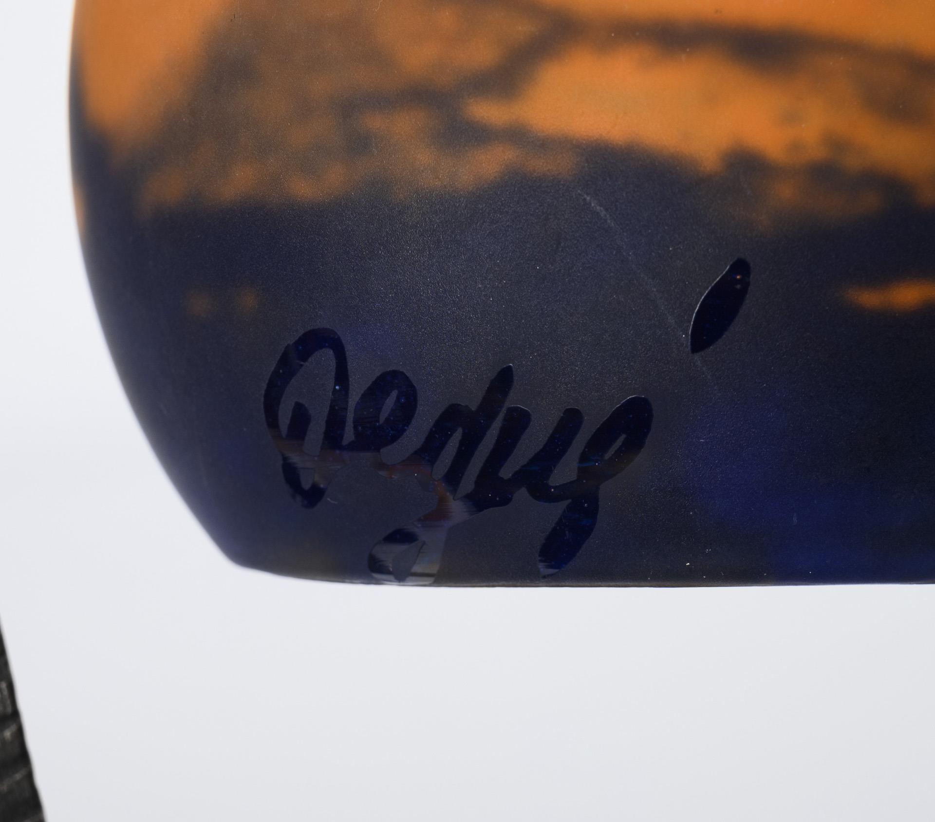 Eisen brüniert, satiniertes farbloses Glas mit orangen und blauen Pulvereinschmelzungen, Elektrifizierung mit Bajonettfassung. H 45 cm. 1,9 kg.