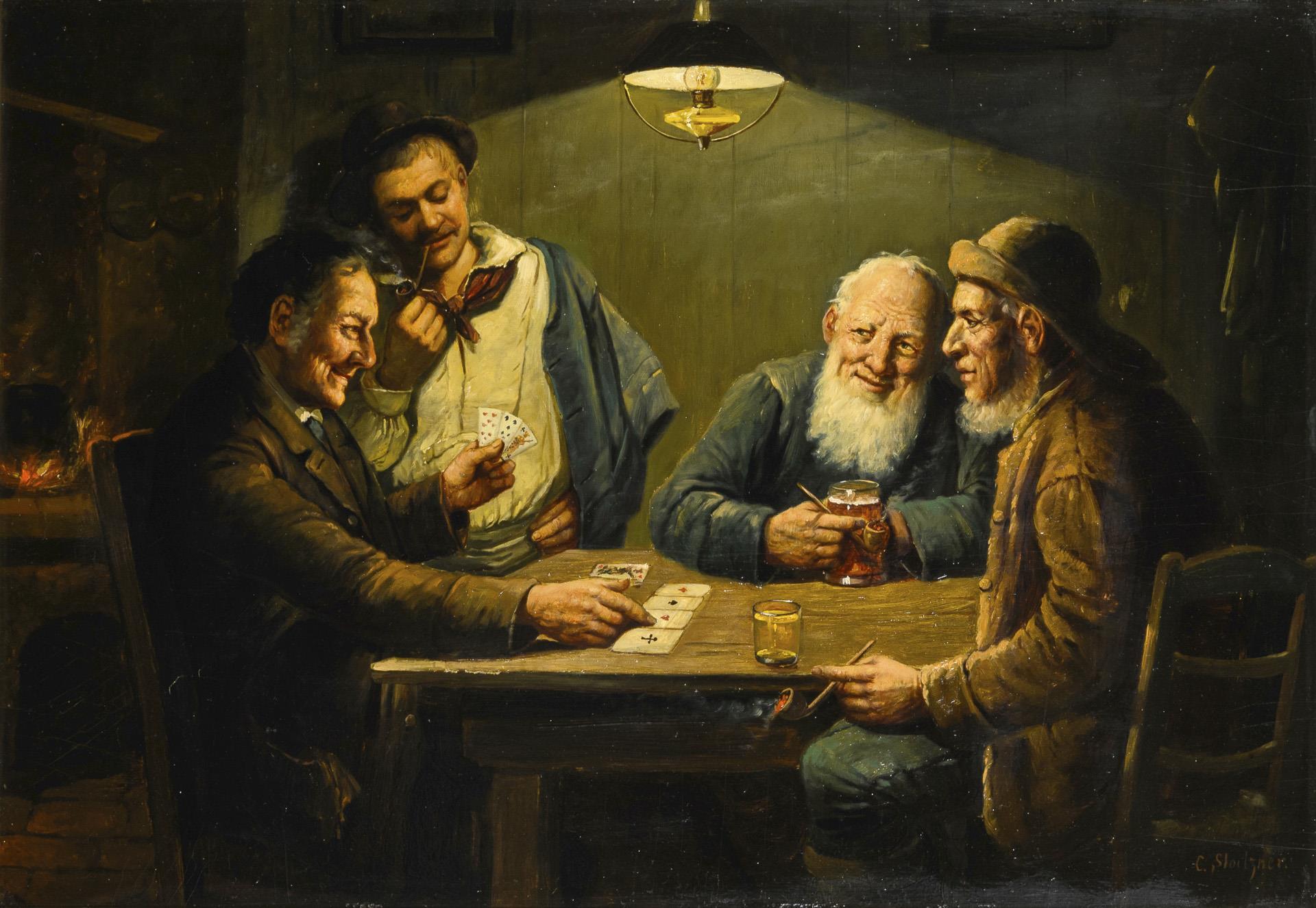 Kartenspieler am Abend an einem Tisch im Lampenschein.