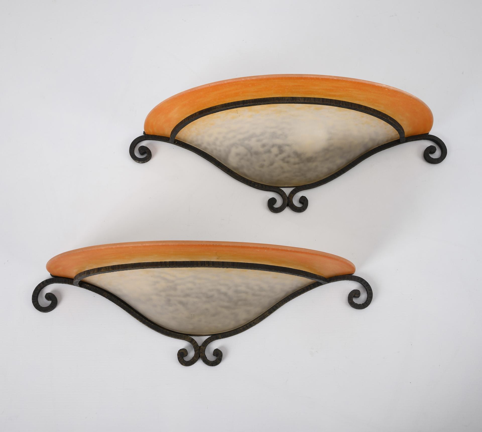 Martellierte Vierkant-Stabhalterungen mit Endvoluten. Halbschalen-Glasschirme mit orangem Rand. 1 kleiner Ausbruch an der Seite, minimale Chips an der verdeckten Kante. Funktion nicht geprüft.