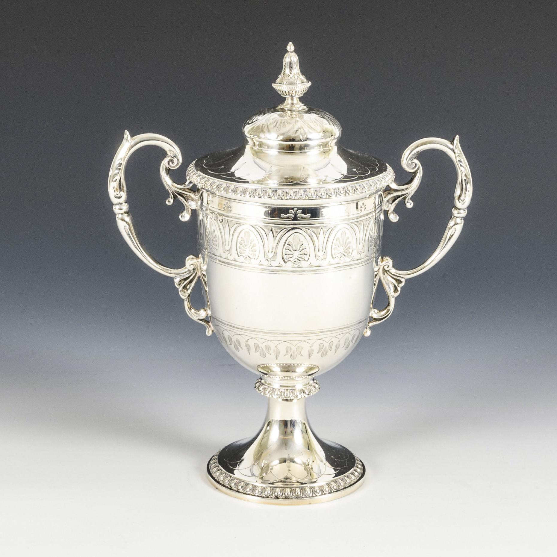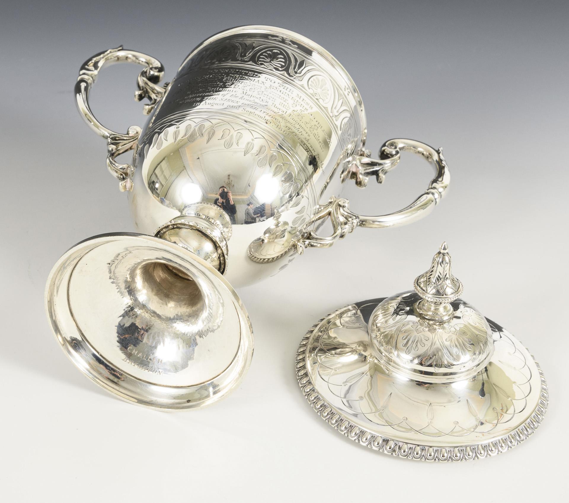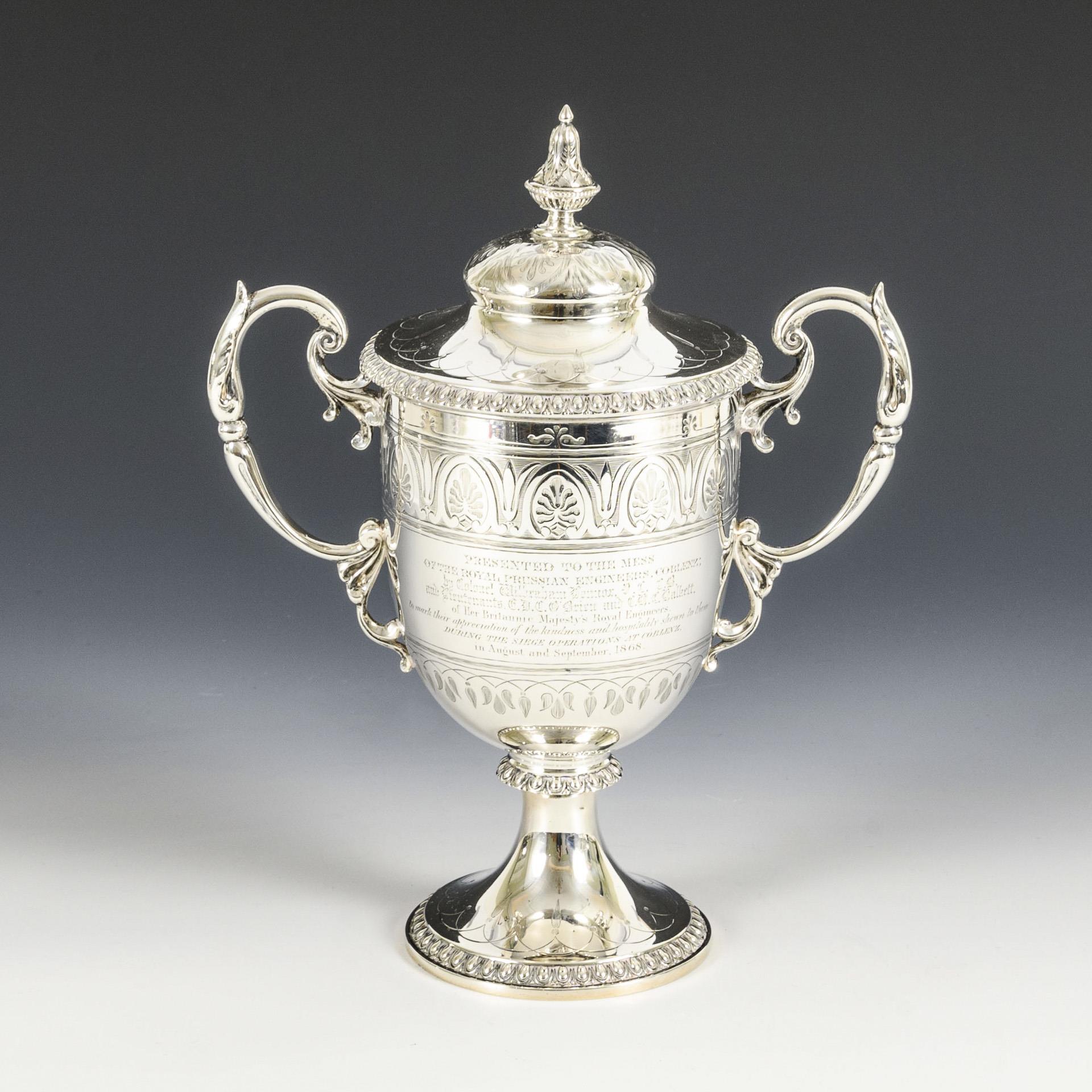 Silberpokal mit Ohrenhenkeln und Palmettdekor. Schauseitig mit ausführlicher Widmung: "Presented to the Mess of the Royal Prussian Engineers, Coblenz (...)". Mehrere Dellen, Deckelknauf repariert.