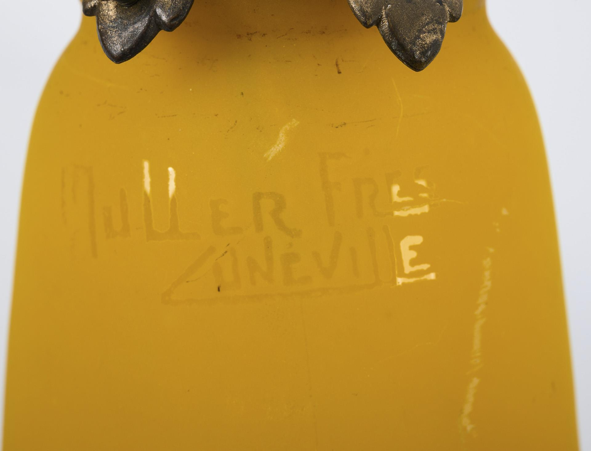 Messing, Gusseisen, satiniertes farbloses Glas mit gelben und blauen Pulvereinschmelzungen, Elektrifizierung mit Schraubfassung. H 58 cm. 3 kg.