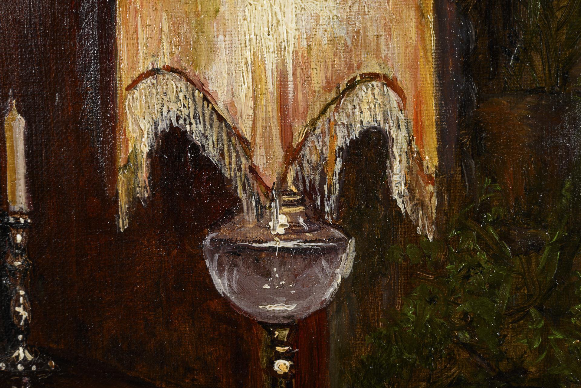 Bürgerliches Interieur einer Frau beim Nähen im Lampenschein.
