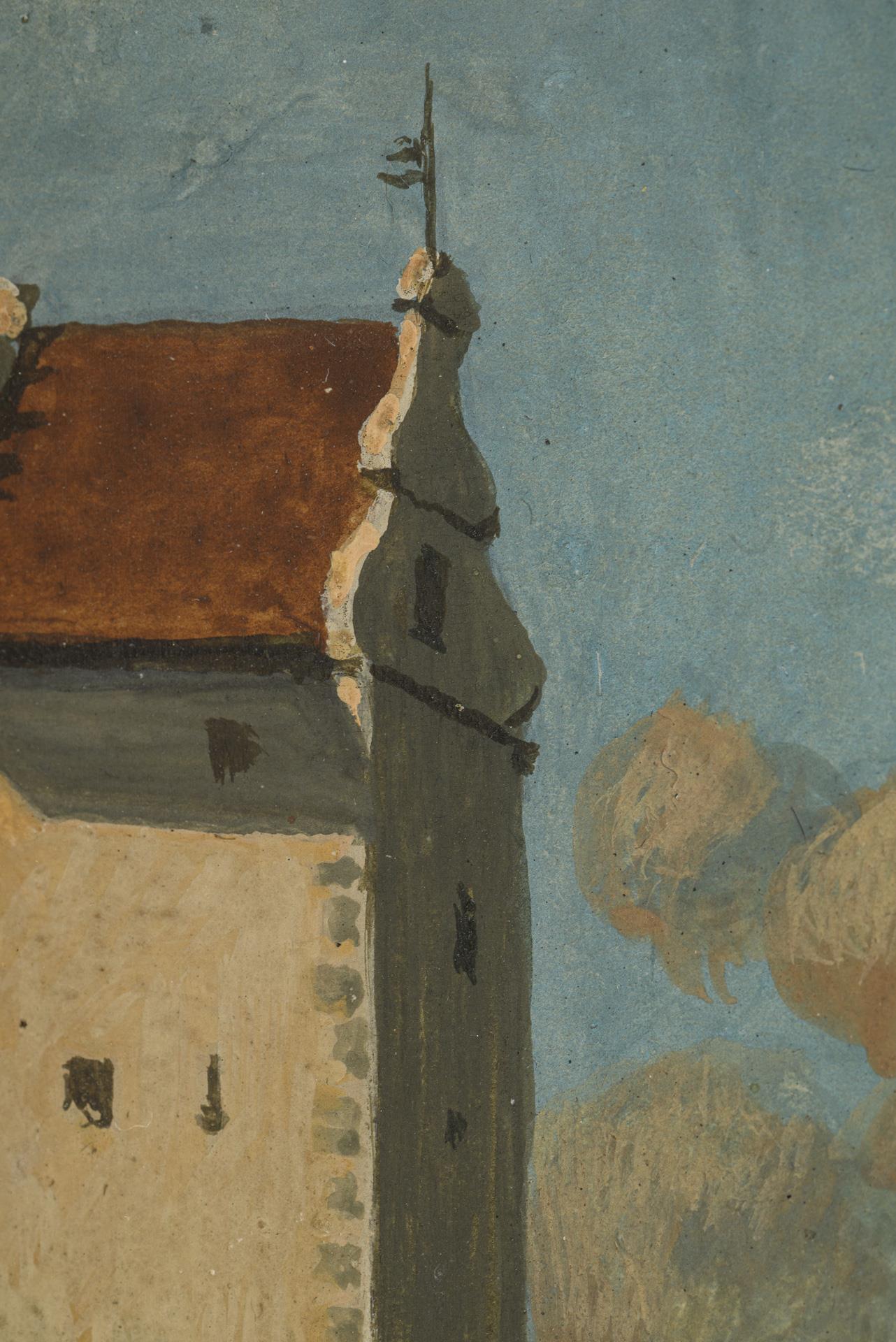Staffagefiguren auf der Straße nahe der Kirche im Sonnenschein. Mittelalterliche Burg oberhalb eines Flusses an einem sonnigen Tag. Enten auf dem Teich in der Sonne.