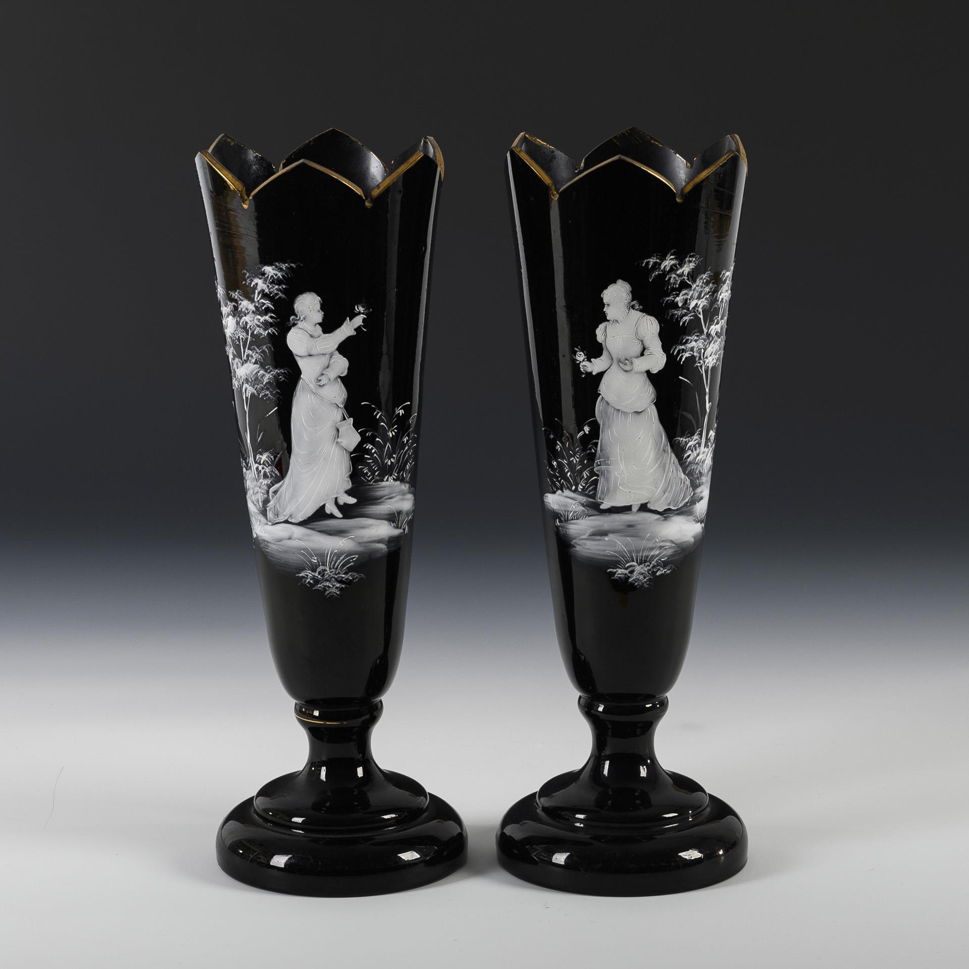 Opakviolettes Glas, weiße Emailfarbe, Goldstaffage. H 35 cm.