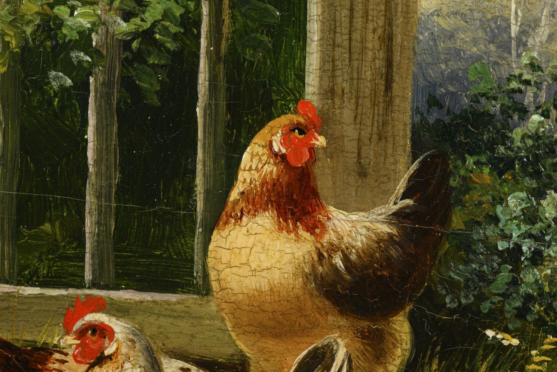 Vier Hühner und ein Hahn im Sonnenschein am Zaun nahe dem Bauernhaus. Minimale Altersspuren.