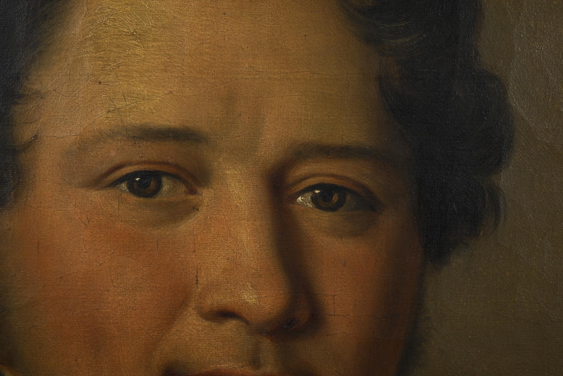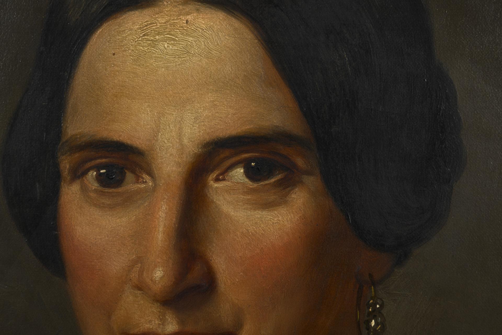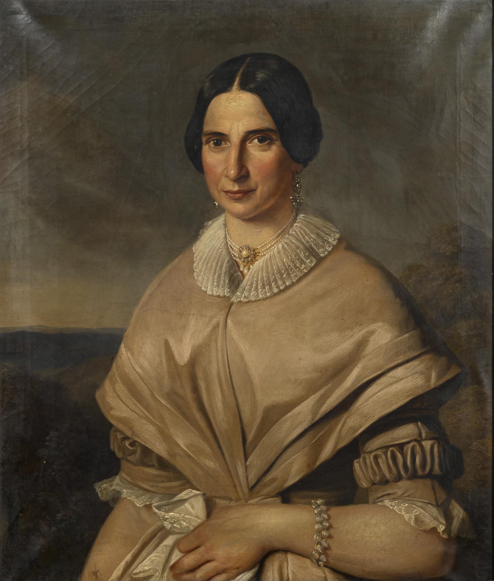 Porträt einer Frau mit schwarzem Haar und im hellen Kleid mit Perlenkette vor weiter bergiger Landschaft sowie Porträt eines jungen Mannes im schwarzen Anzug vor neutralem Hintergrund. Eine kleine restaurierte Stelle mit Hinterklebung.