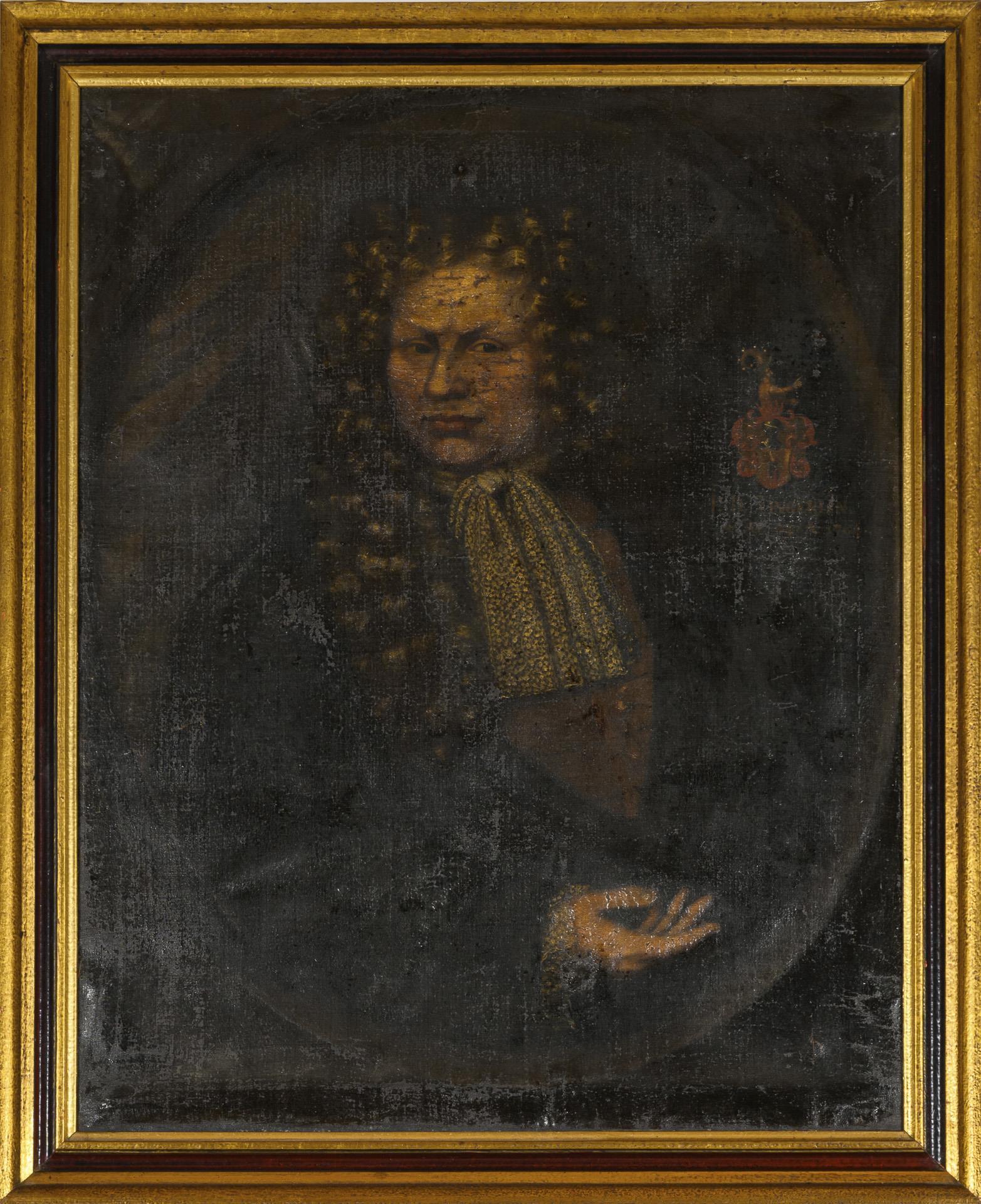 Porträt eines Mannes im Alter von 64 Jahren mit Allongeperücke, in oval gemaltem Passepartout. Restaurierungsbedürftig.