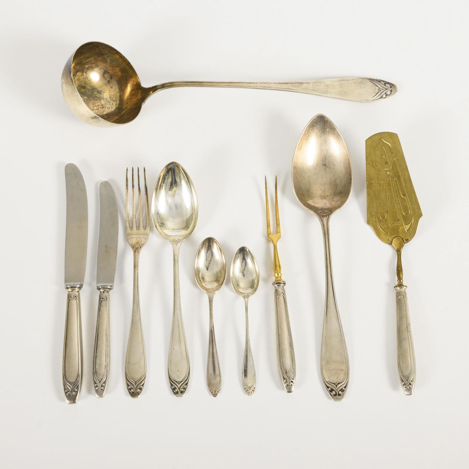 Stilisiertes Maiglöckchen-Dekor. 3 Speisegabeln, 4 Speisemesser, 5 Frühstücksmesser, 3 Suppenlöffel, 6 Kaffeelöffel, 8 Mokkalöffelchen und 4 Vorlegeteile. Dazu 1 versilberter Kaffeelöffel. Gebrauchsspuren.