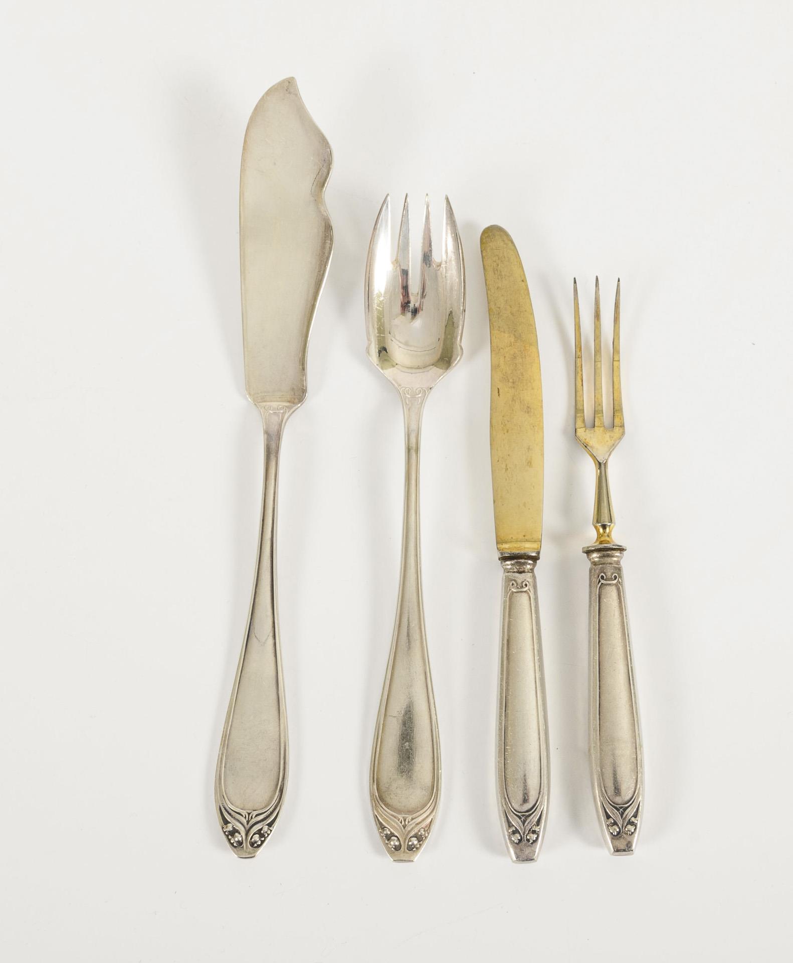 26 Teile mit stilisiertem Maiglöckchen-Dekor. 7 Fischgabeln und 7 Fischmesser (L 17/20,5 cm). 6 Obstgabeln und 6 Obstmesserchen (L 15/16,5 cm). Gebrauchsspuren.