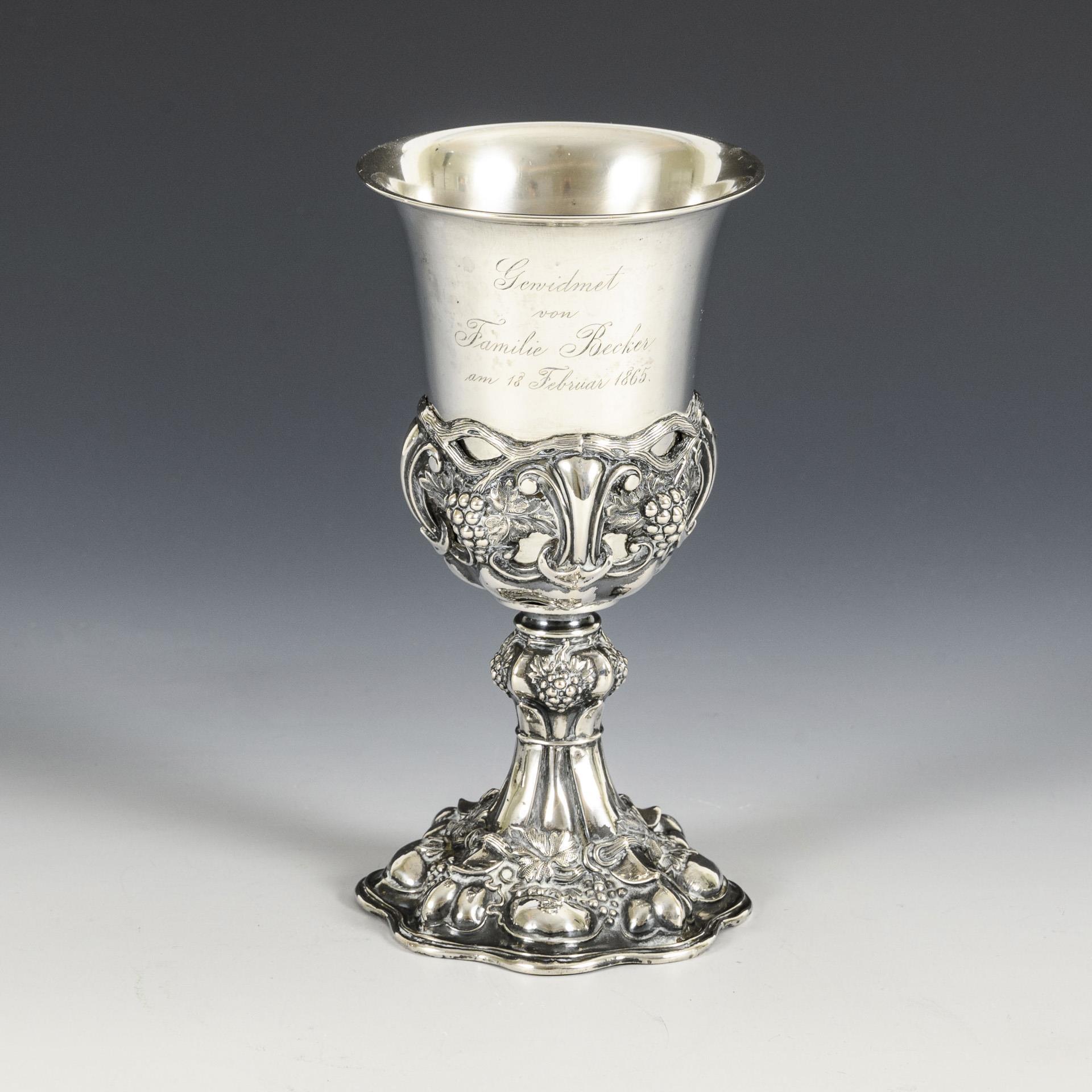 Reich reliefierter Pokal mit Weinreben und Widmungsgravur: "Zur silbernen Hochzeit der Eheleute Beckler. Gewidmet von Familie Becker am 18. Februar 1865.". Minimal gedellt, Fuß mit kleinen Bruchstellen.