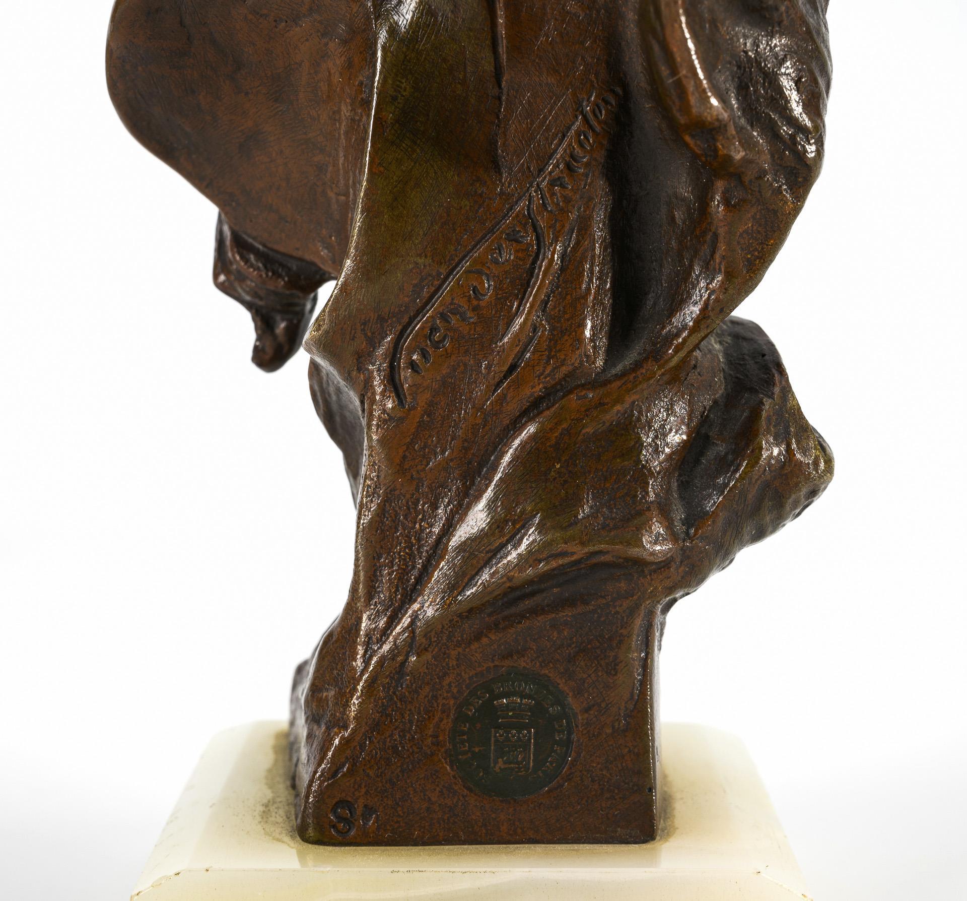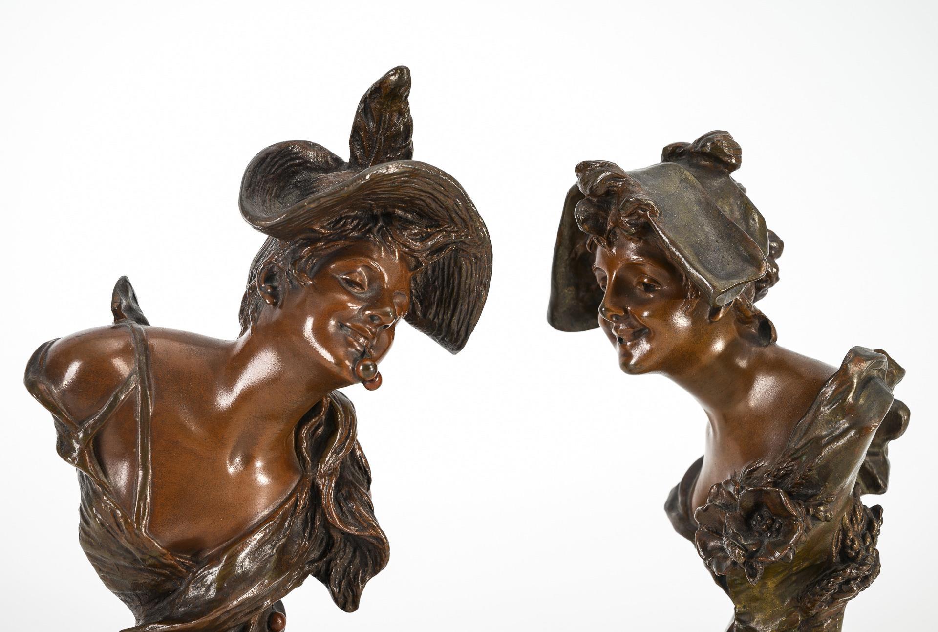 Je Bronze zweifarbig patiniert, Plinthen aus weißem Onyxmarmor. Je bezeichnet, je Gießermarke "Société des Bronzes de Paris". H 20,5 bzw. 18 cm, gesamt maximal 22 cm. Gesamt 3,4 kg.