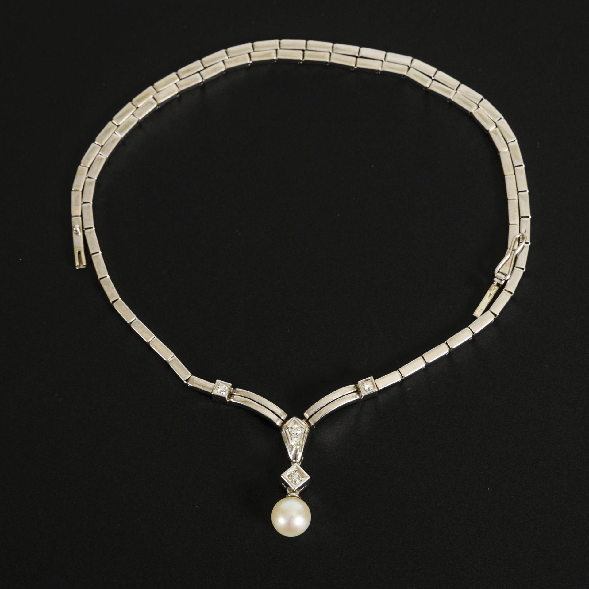 Collier mit Abhängung, bestehend aus einem V-förmig gearbeiteten Mittelstück mit 4 Brillanten und einem Hängeelement mit Brillant und einer Zuchtperle. Gliederkette mit Kastenschloss und Achtersicherung.