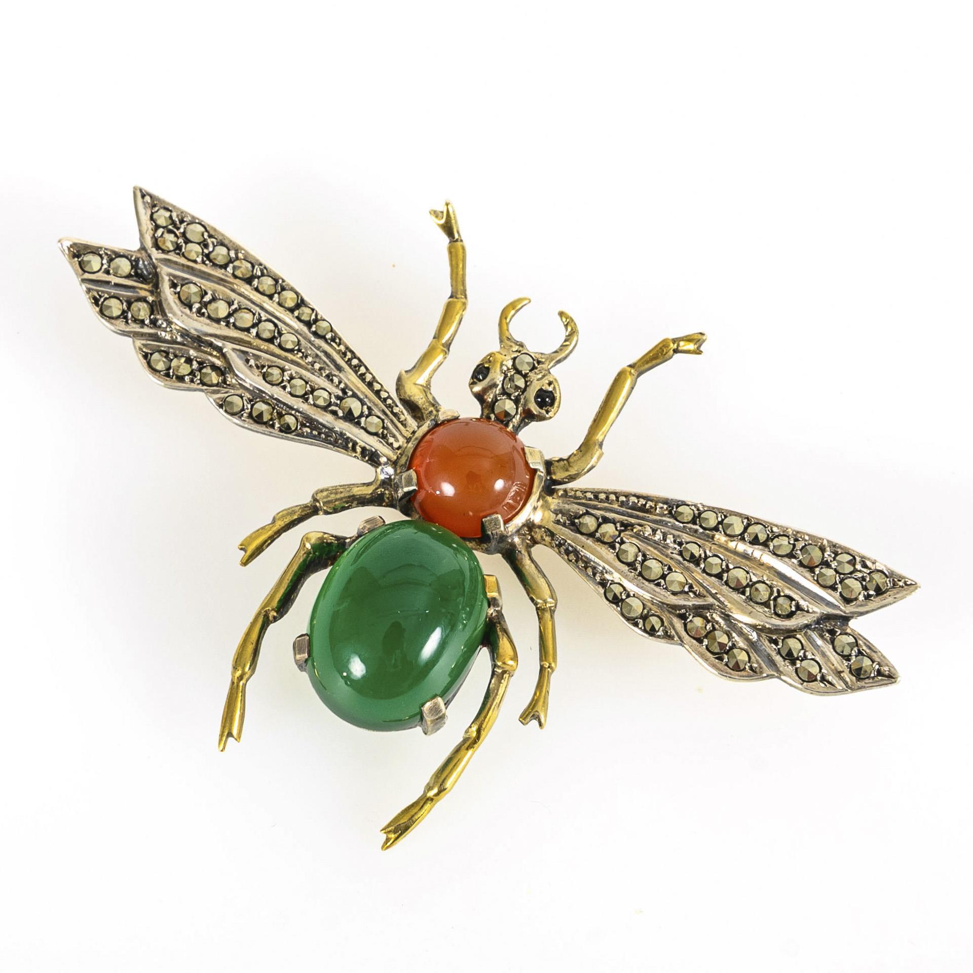 Große Insektenbrosche mit Farbsteinen und Markasiten.