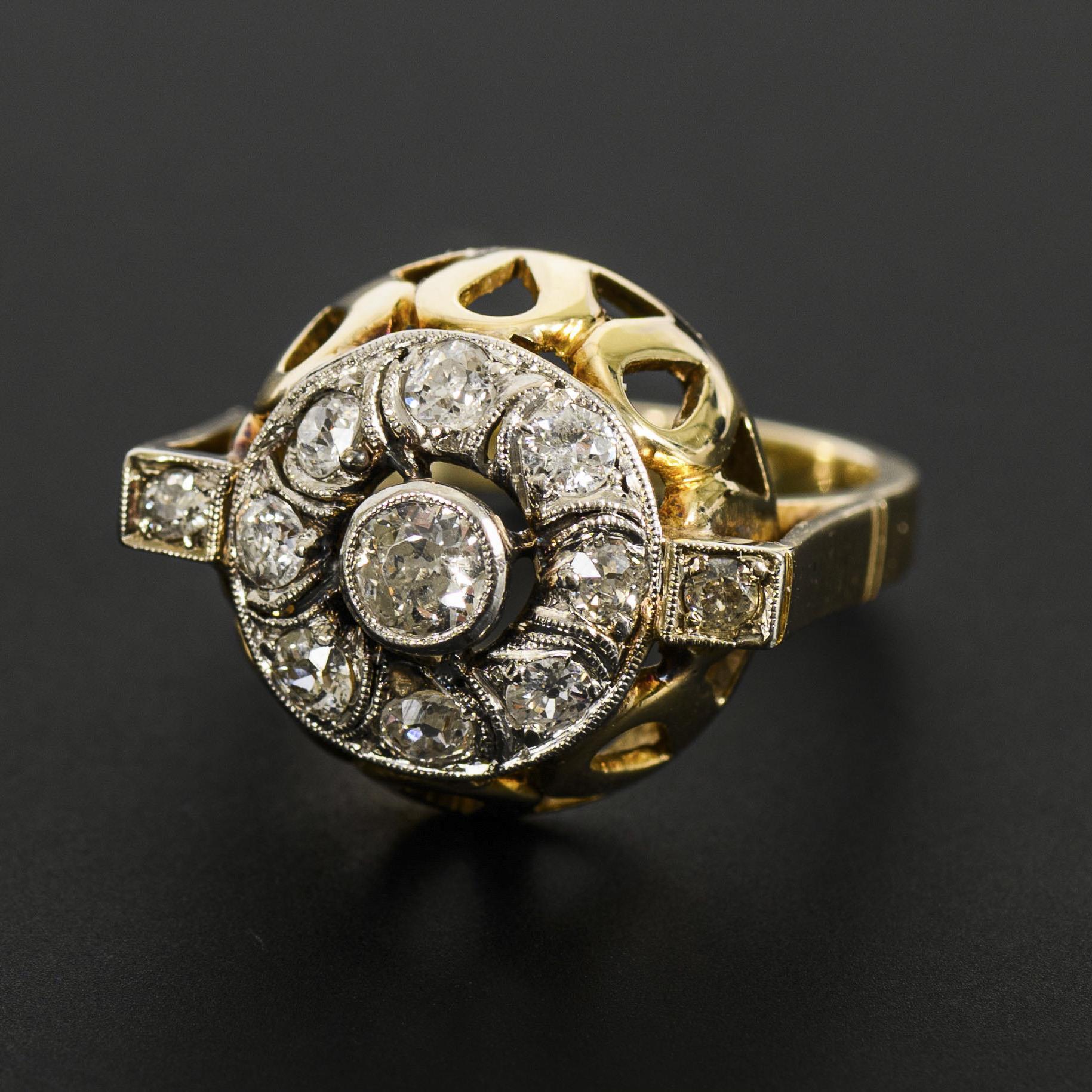Ring des späten Art déco mit erhabenem Ringkopf in Gelbgold, besetzt mit 11 geometrisch angeordneten, in Weißgold gefassten Brillanten.