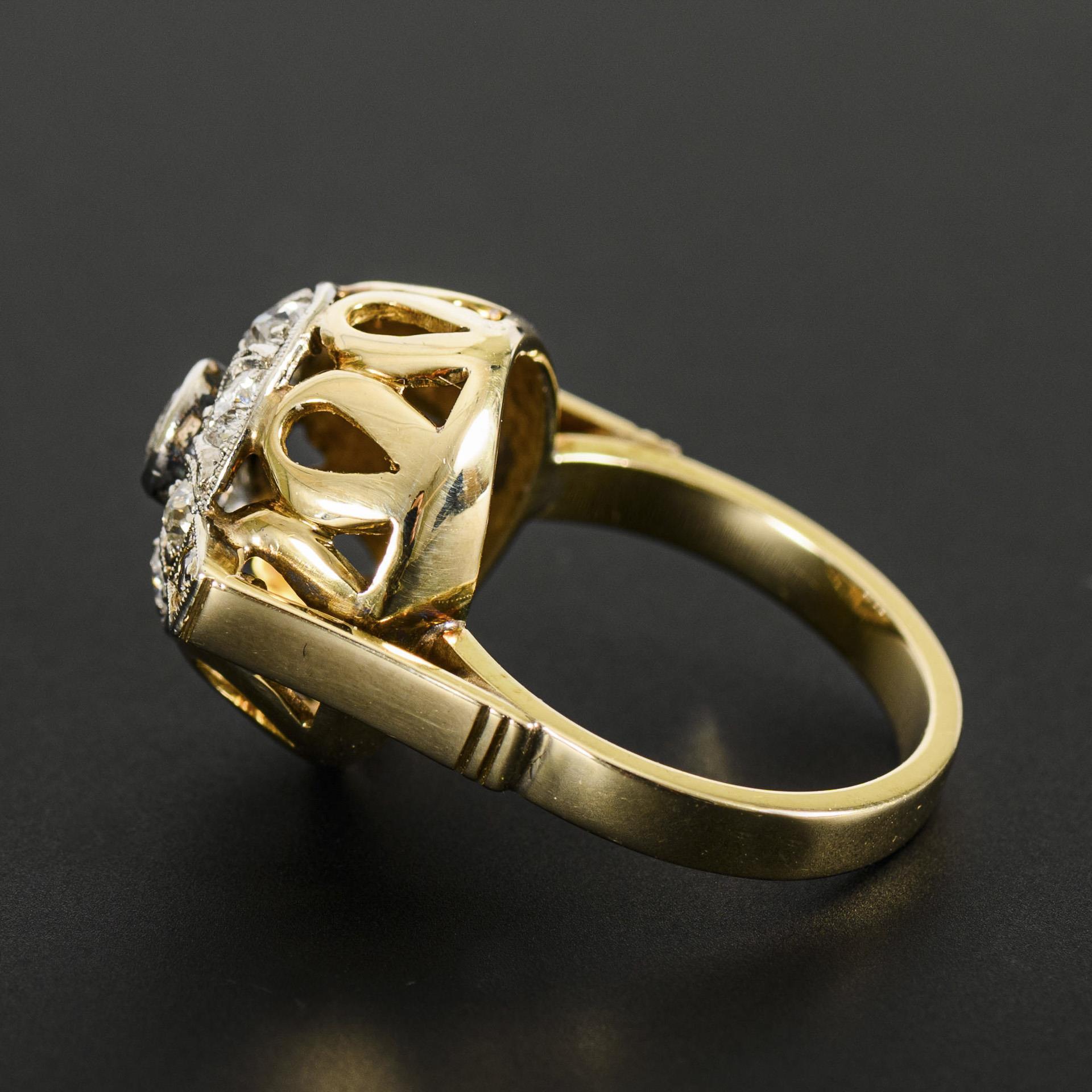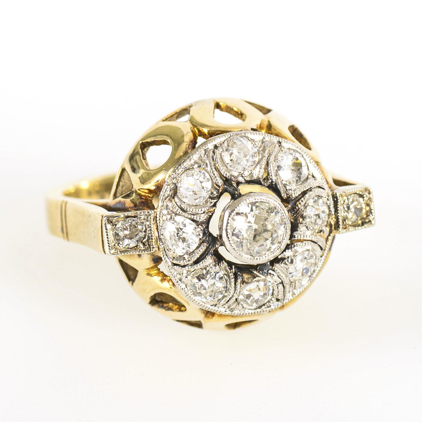 Ring des späten Art déco mit erhabenem Ringkopf in Gelbgold, besetzt mit 11 geometrisch angeordneten, in Weißgold gefassten Brillanten.