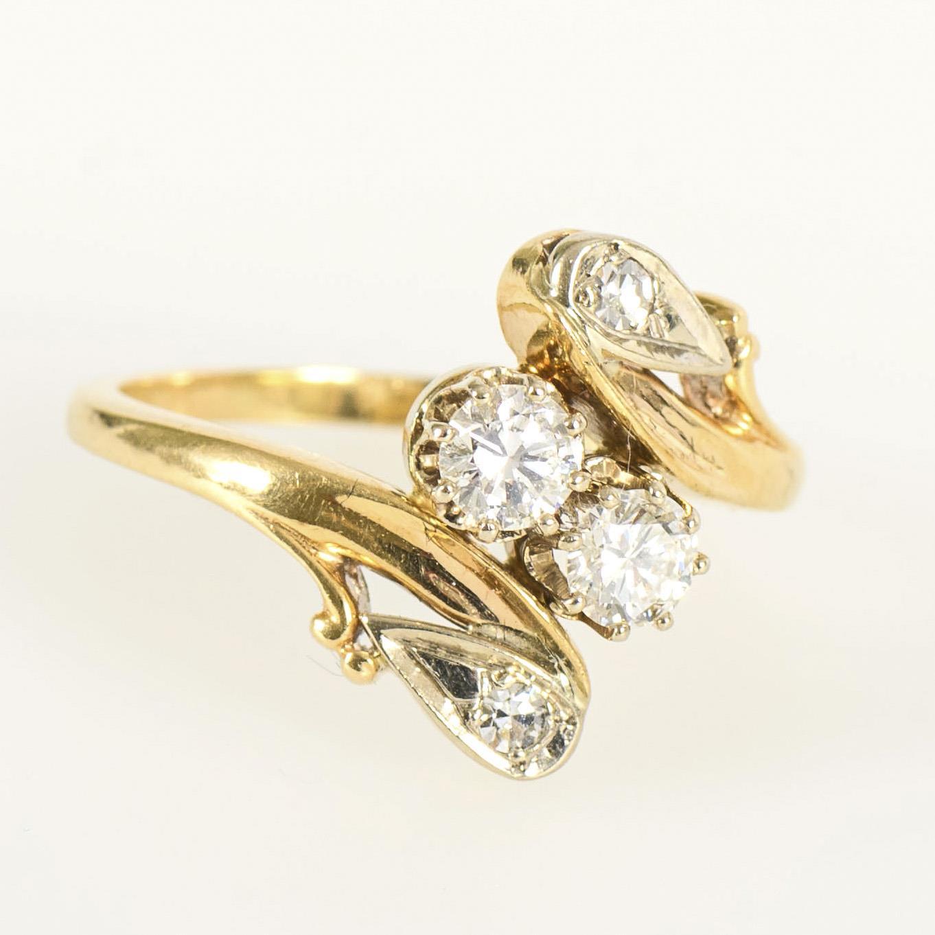 Ring in schwungvoller Ausgestaltung mit 2 größeren Brillanten und 2 kleineren Altschliff-Diamanten.