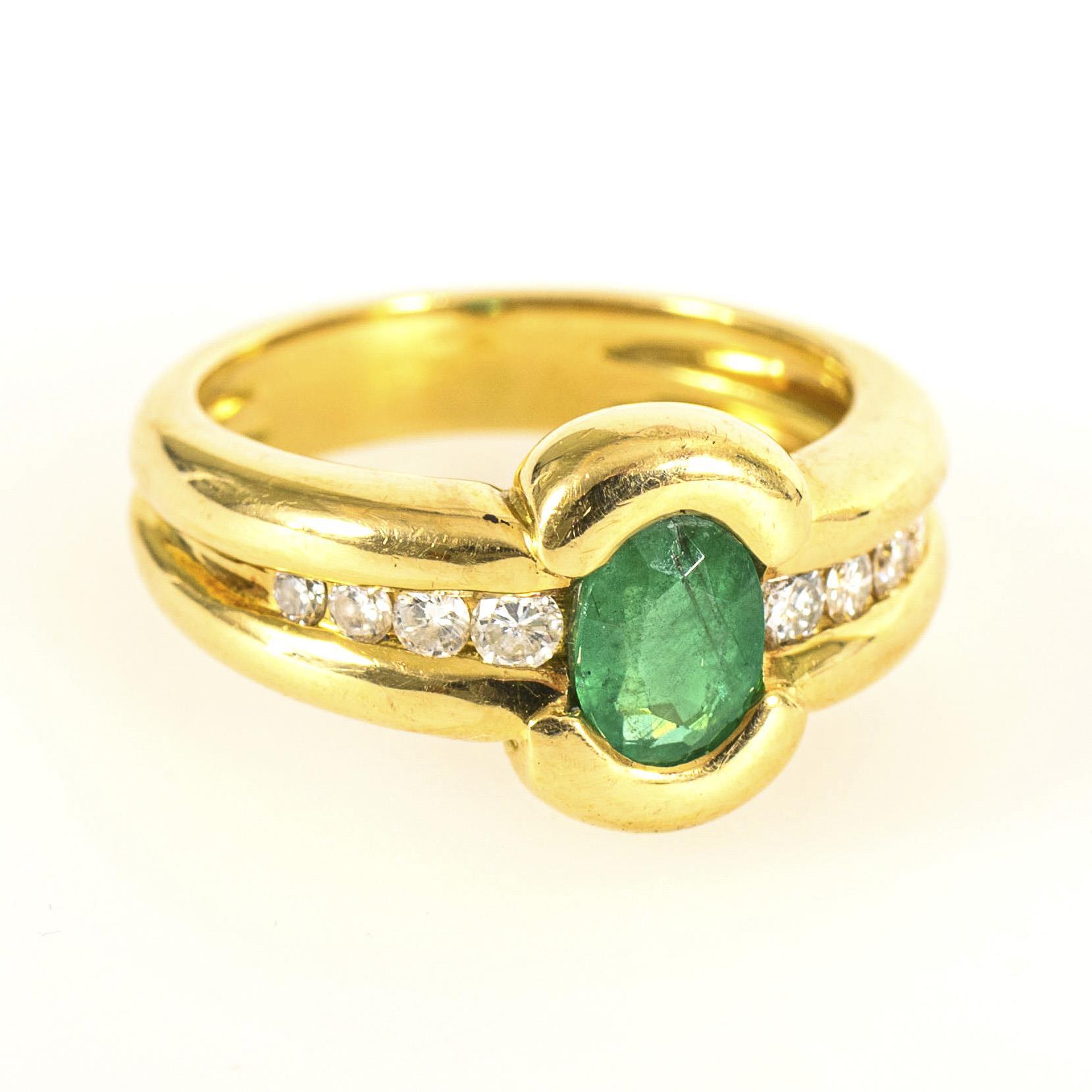 Ein großer Smaragd im Ovalschliff, flankiert von je 4 kanalgefassten Brillanten an den Ringschultern, in breiter Schiene. Leichte Tragespuren an der Ringschiene.