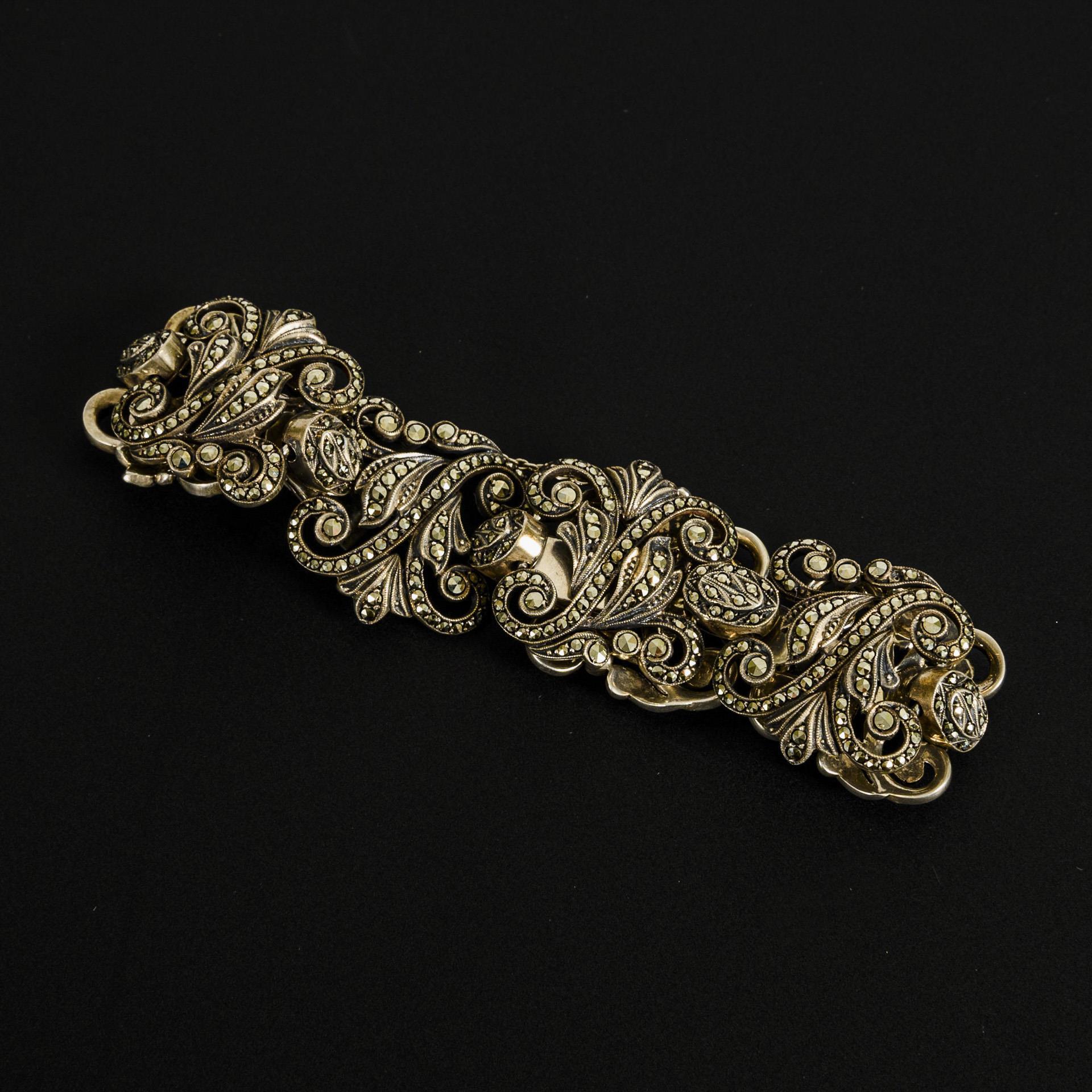Breites Armband mit Besatz von Markasiten, in floraler Formensprache gestaltet, der Verschluss mit Sicherungskettchen. Ein Markasit fehlt.