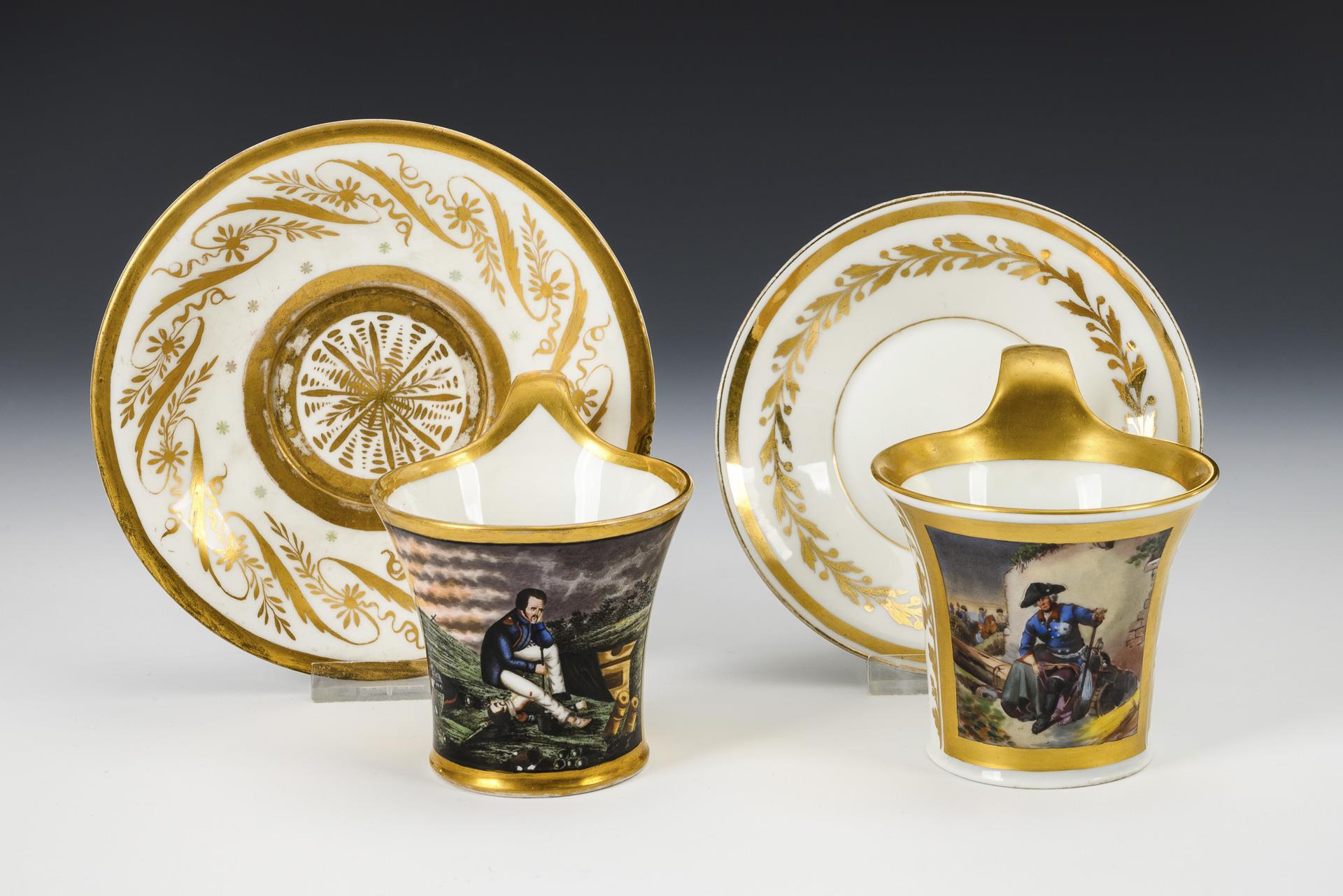 1x KPM BERLIN, 1828: Campanertasse mit der schauseitigen Darstellung eines Soldaten auf einem Schlachtfeld, im Tassenboden bezeichnet "(...) 1828" verso vegetabile Goldmalerei (H Tasse 9 cm, Ø originale Untertasse 14,5 cm). / 1x FÜRSTENBERG, 1906-1918: Campanertasse mit der schauseitigen Darstellung des vor einer Mauer sitzenden preussischen Königs Friedrich II. (H Tasse 9 cm, Ø ergänzte Untertasse 12,5 cm). Partieller Goldabrieb, KPM-Untertasse mit 3 Randchips.