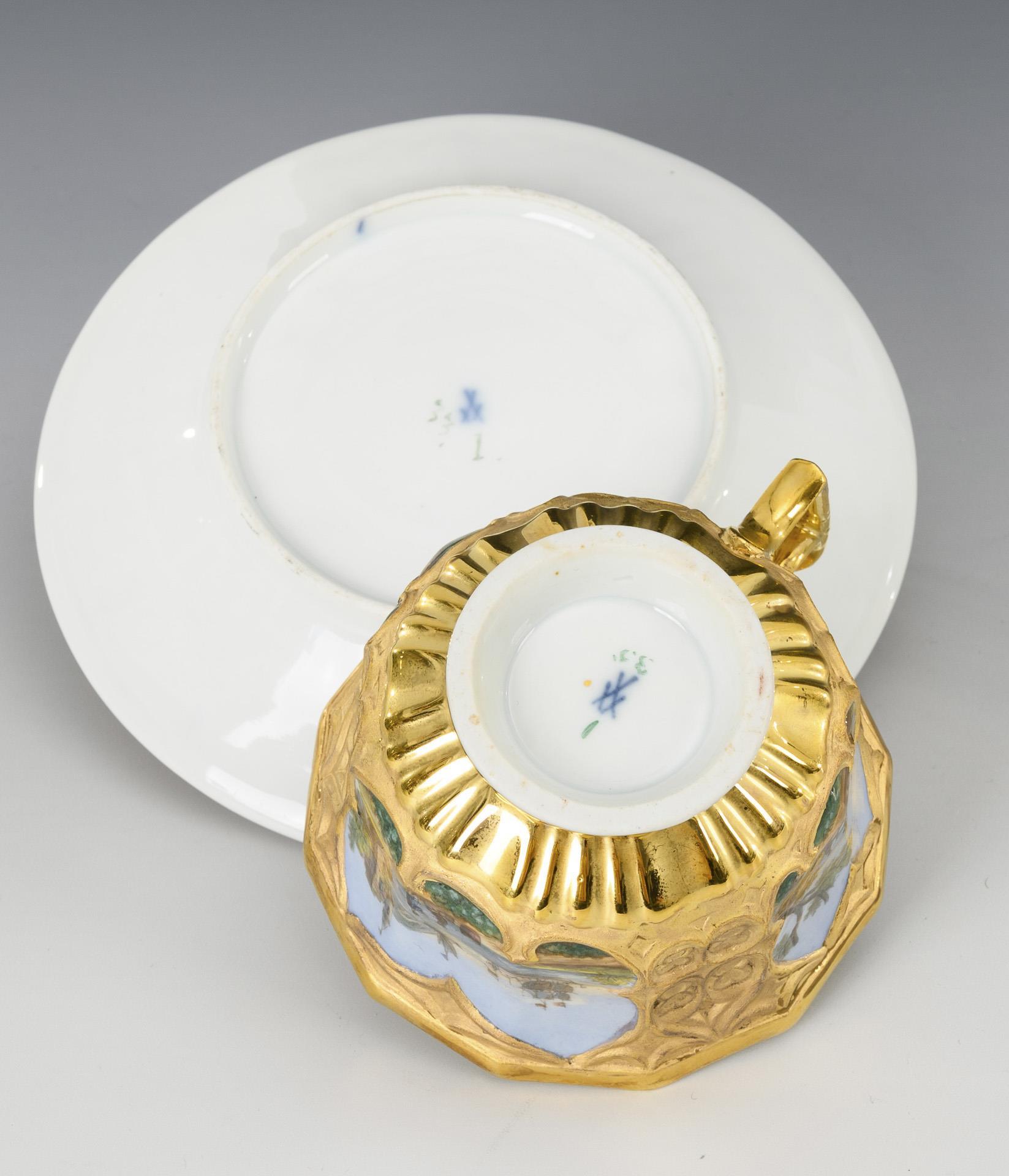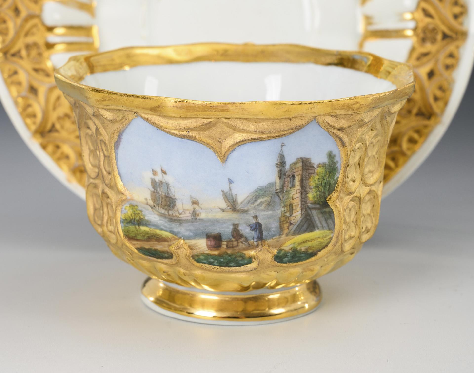 Gefußte, polygonale Glockentasse mit spitz geschweiftem Henkel und gotisierendem, goldbronziertem Relief. In drei Kartuschen die Darstellung zweier Küstenlandschaften mit Kaufleuten, Schiffen und Waren sowie einer bergigen Landschaft mit Wanderern. Restaurierter Wandungshaarriss an der Tasse, Goldabrieb an der Untertasse.
