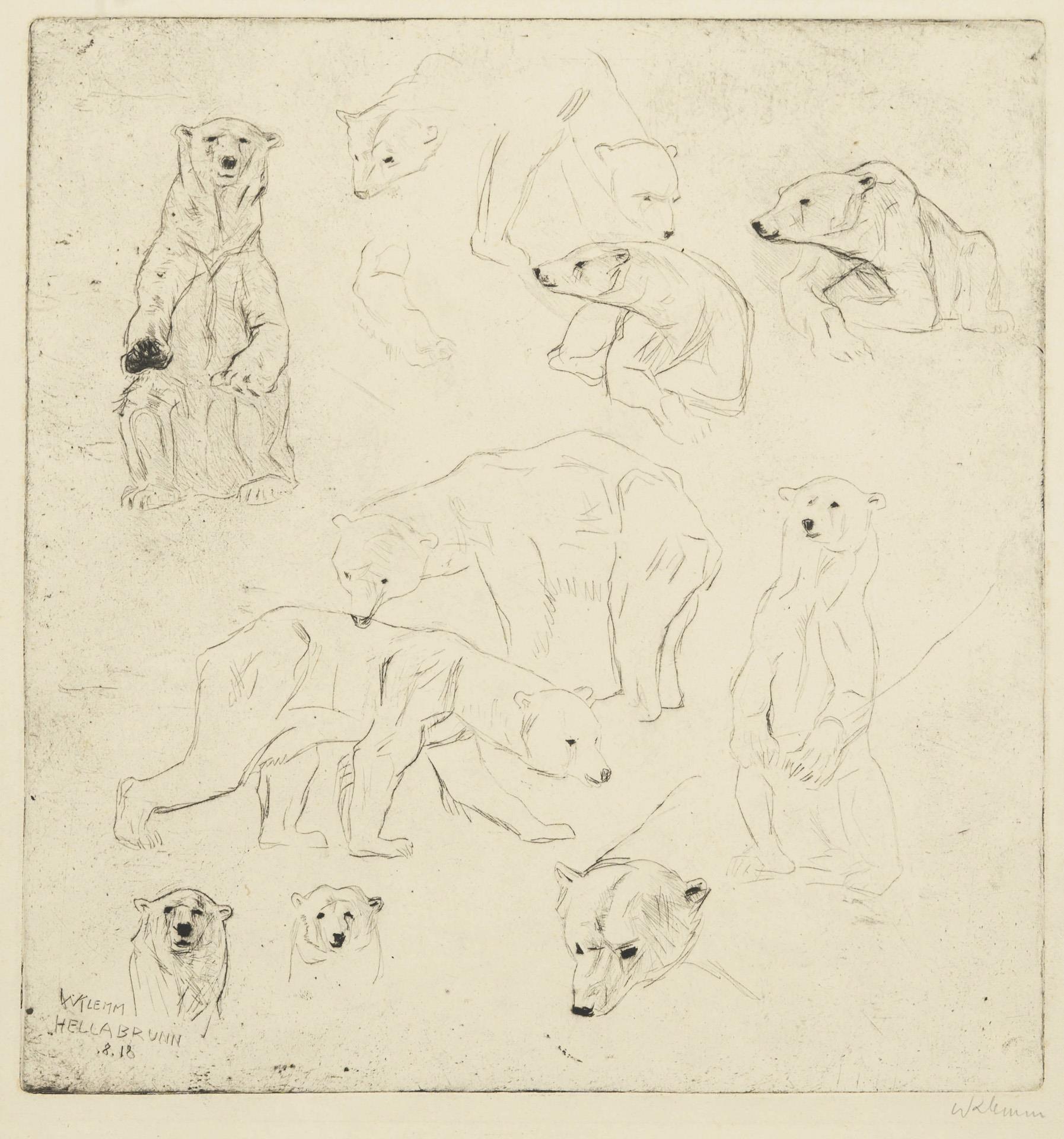 Druckgrafische Vervielfältigung eines Studienblattes von Eisbären, in verschiedenen Haltungen und Ausarbeitungsstadien, unten links auf der Druckplatte signiert mit "WKlemm/Hellabrunn .8.18".