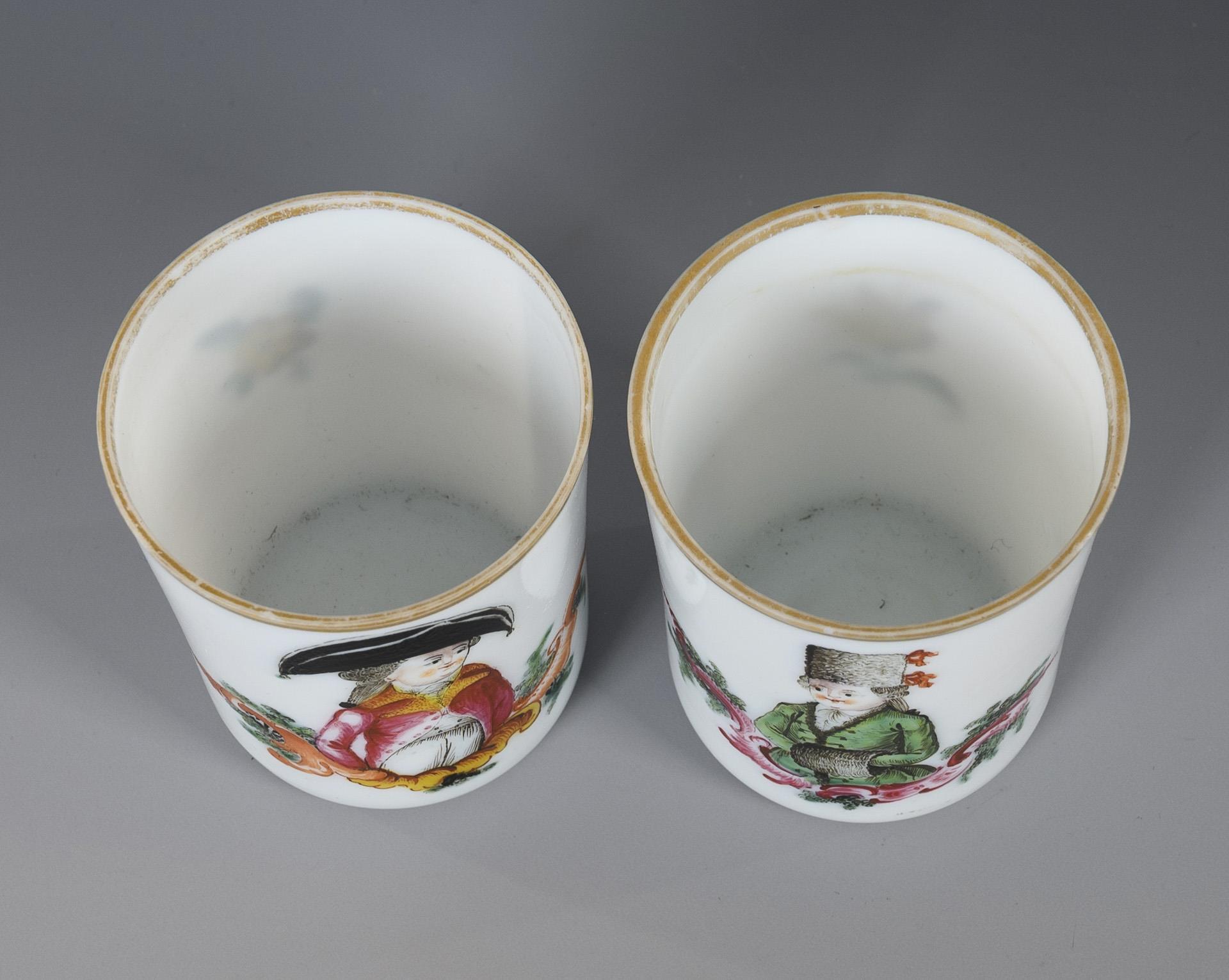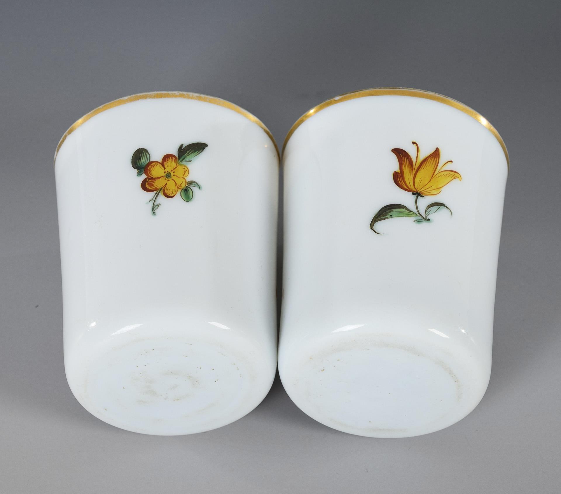 Zylinderbecher. Schauseitig über einer Rocaille die Darstellung eines jungen Herren in Uniform bzw. einer jungen Dame im Reitkostüm. Goldrand berieben, minimale Randbestoßungen.