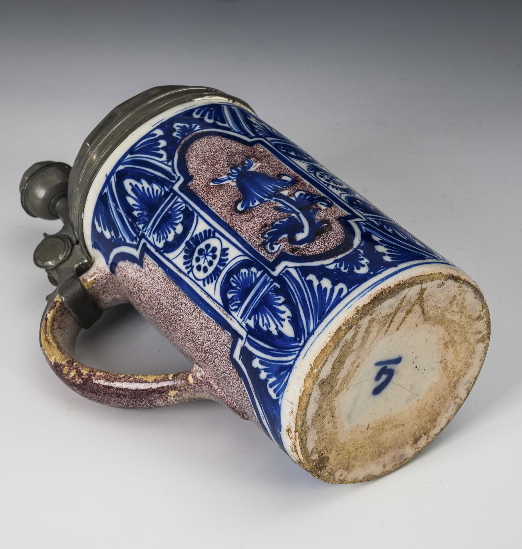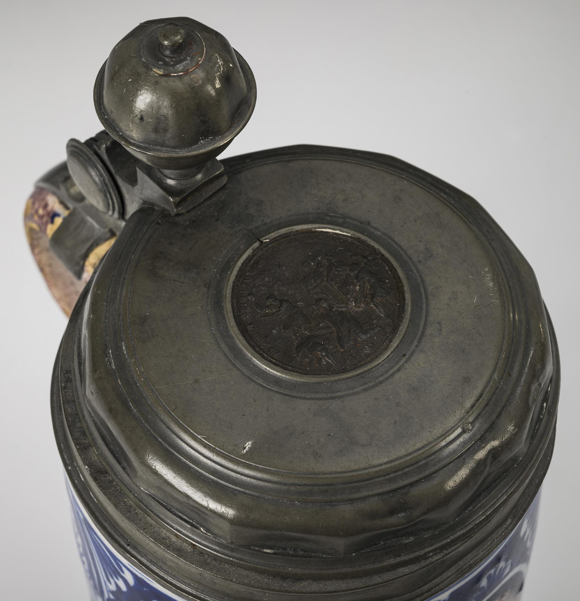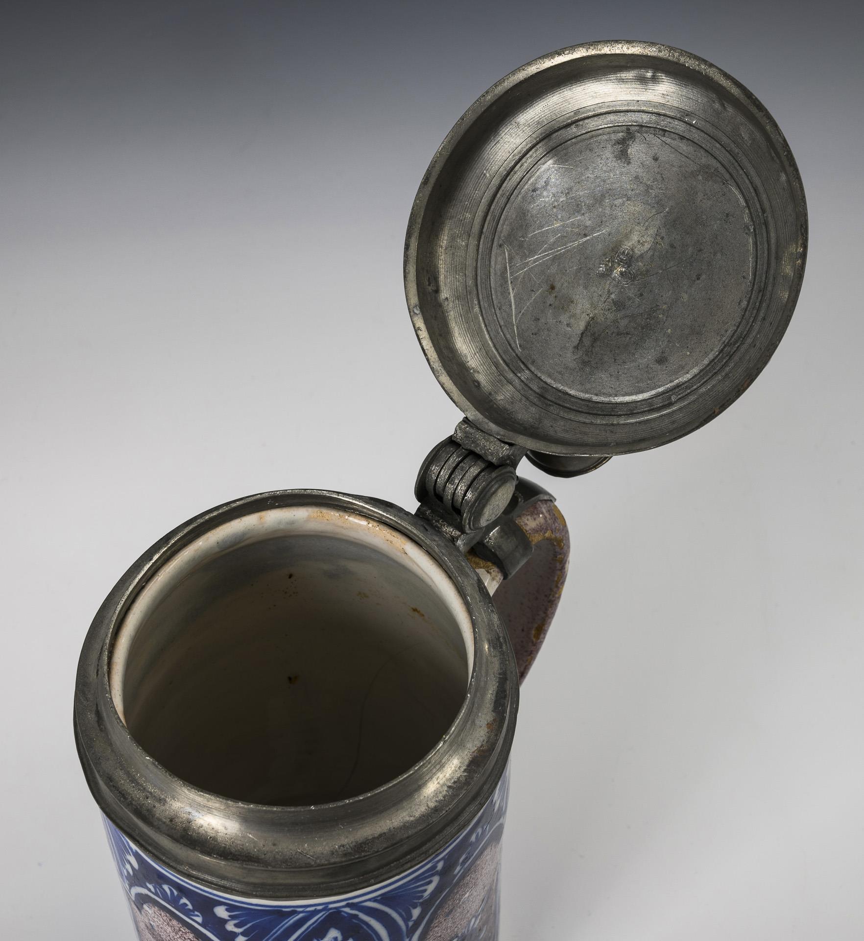 Zylindrischer Korpus mit Bandhenkel, umlaufend Pilaster und Barockreserven mit Blumen. Profilierter Zinndeckel mit Reliefplakette und Kugeldrücker, innen gepunzt. Partiell rissig, Glasurdefekte, Zinn mit Defekten und Gebrauchsspuren.