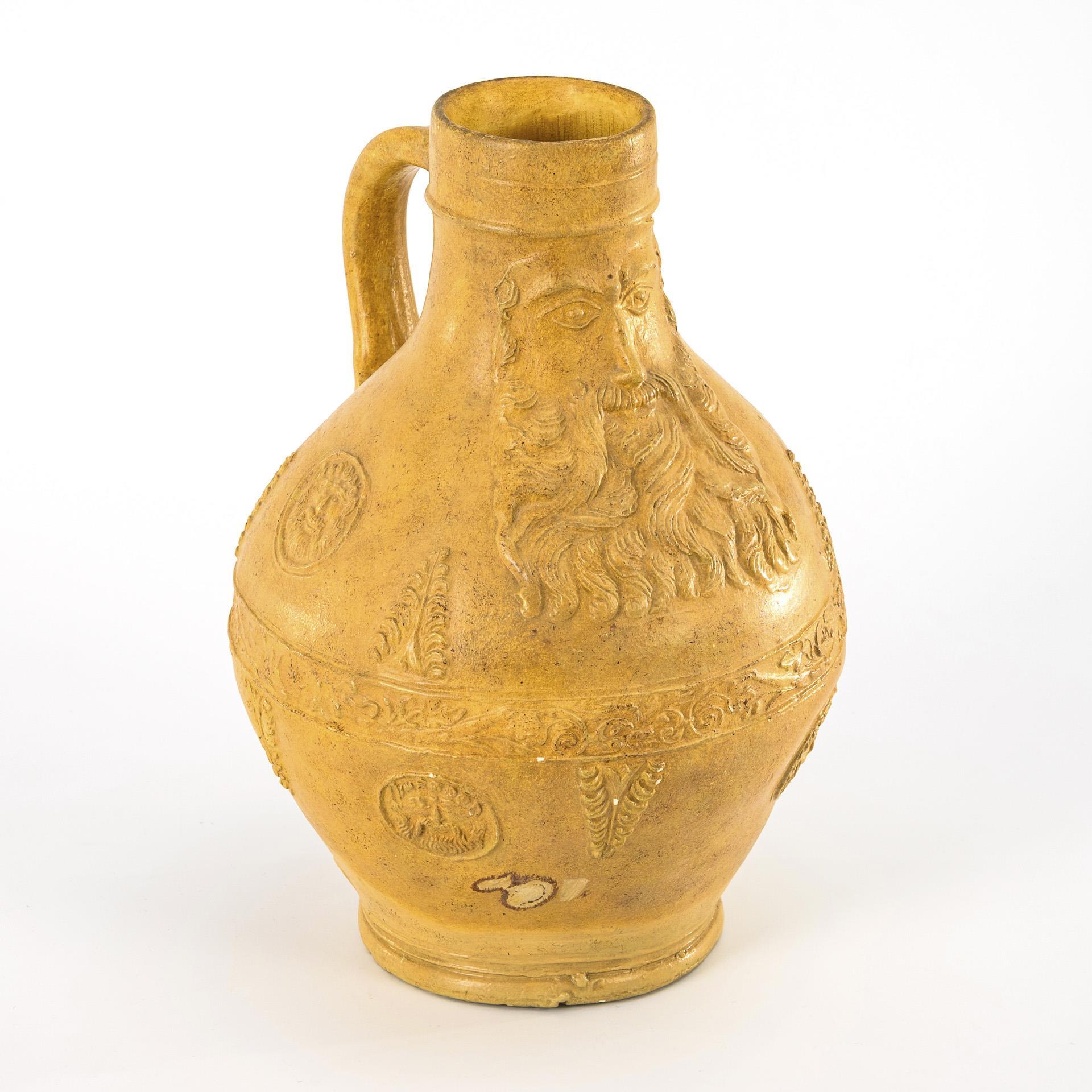 In Art der barocken Köln-Frechener Bartmannskrüge gefertigter kugeliger Gefäßkörper mit Enghals und gekehltem Henkel sowie abgesetztem Stand. Auflagendekor mit geschnitzter Bartmaske, Blumenfries, Bartmann-Medaillons und Akanthusblätter. Partiell kleine Chips.