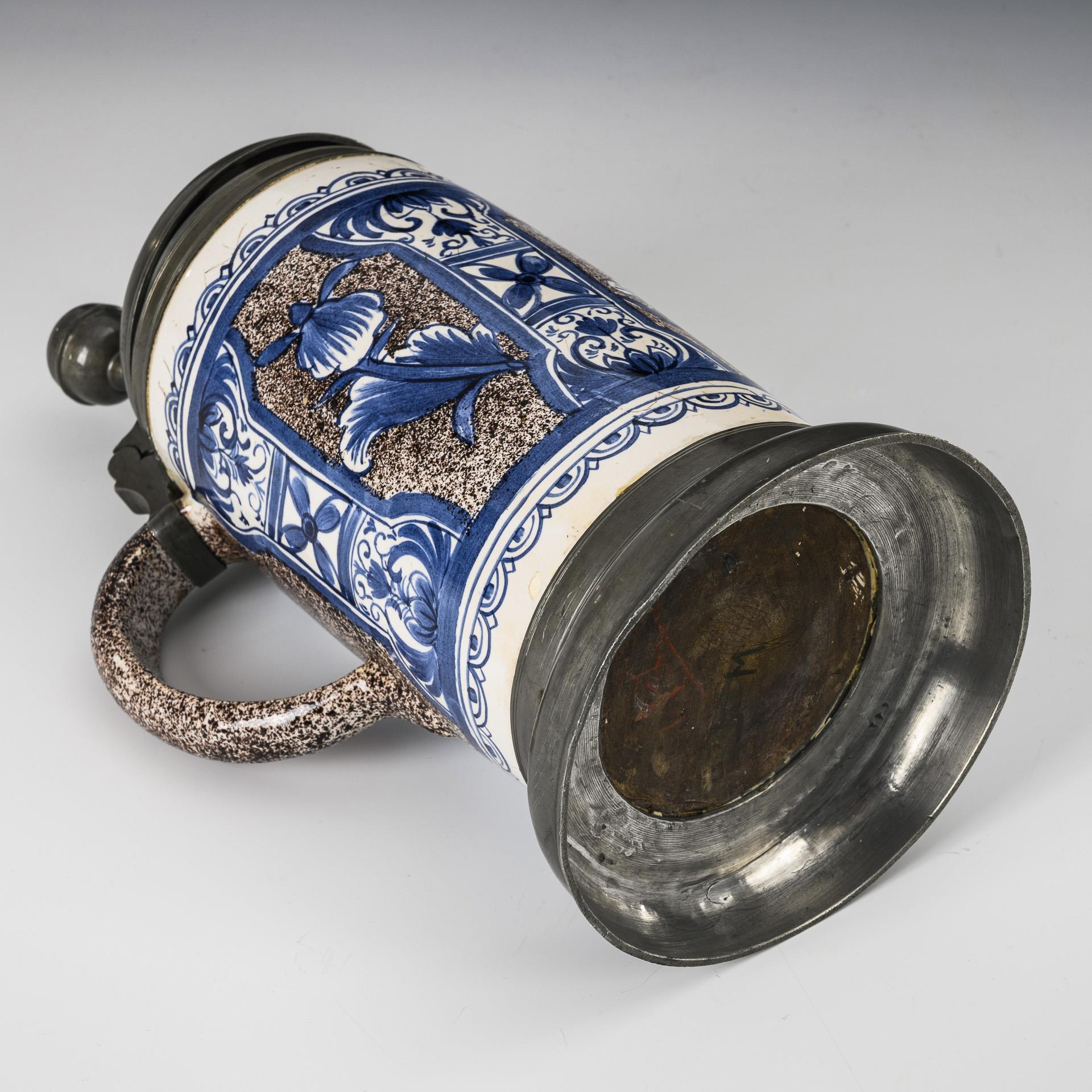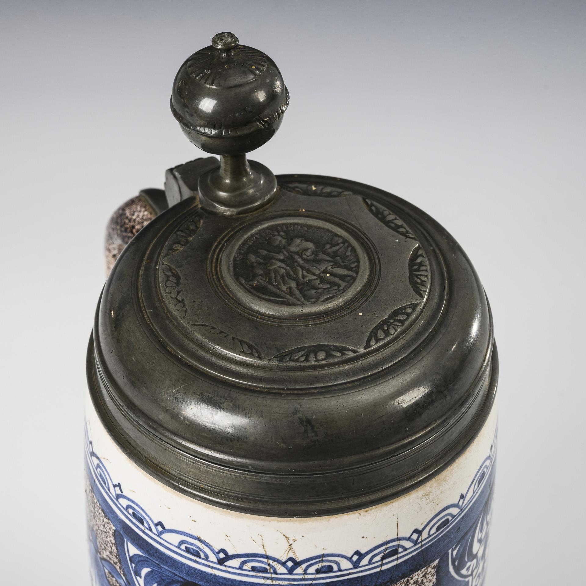 Zylindrischer Korpus mit Bandhenkel, umlaufend Pilaster und Nischendekor mit Blumen. Zinndeckel mit Reliefplakette und Kugeldrücker, innen gepunzt, Zinnstand . Leichte Alters- und Gebrauchsspuren, partiell Glasurdefekte.