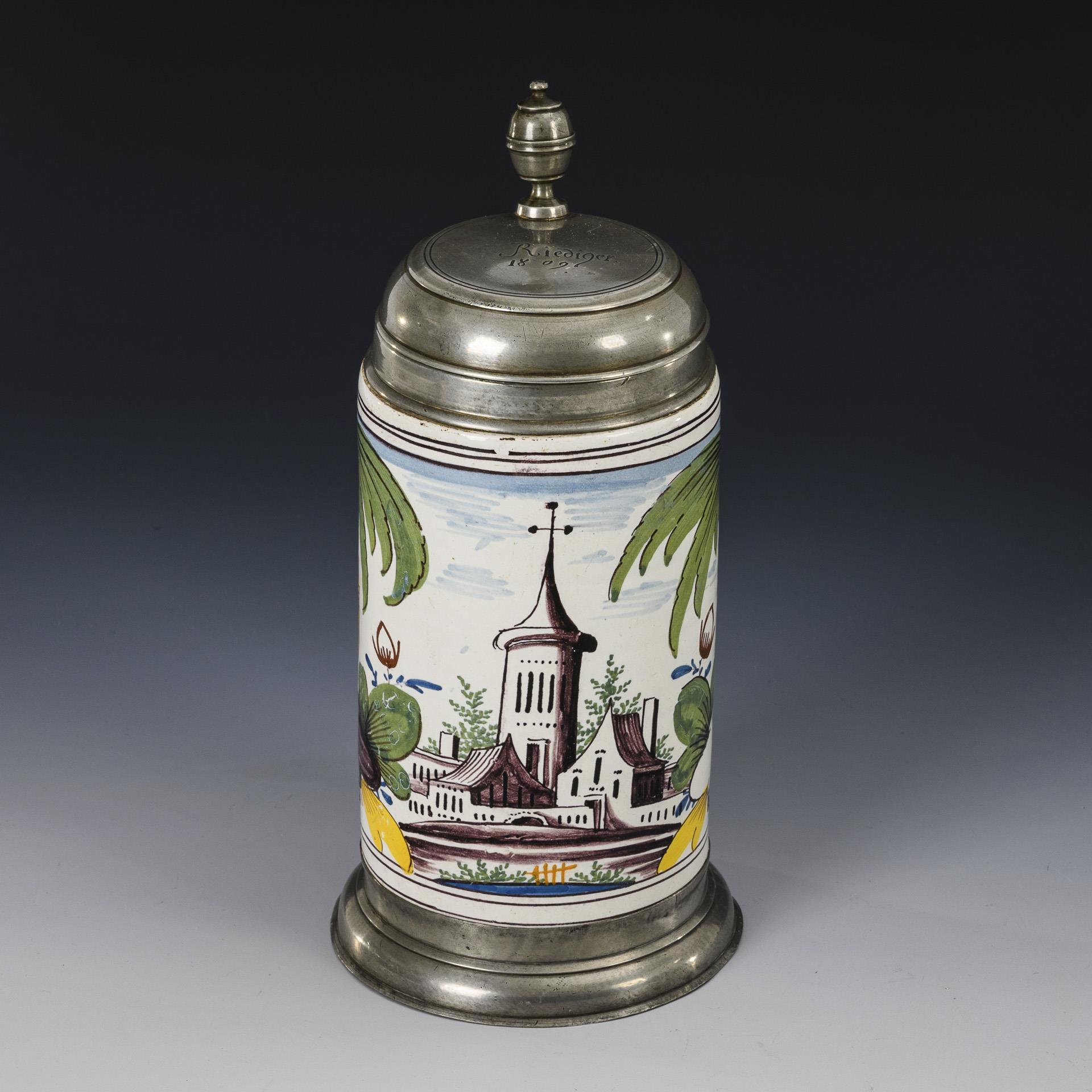Zylindrischer Korpus mit verziertem Bandhenkel, schauseitig eine Stadtarchitektur, flankiert von Palmbäumen. Zinnmontierung mit "Riediger 1809" graviertem Deckel, Kugeldrücker, Zinnband und Zinnstand. Partiell leicht glasurbestoßen und berieben, Zinnband am unteren Ansatz defekt.