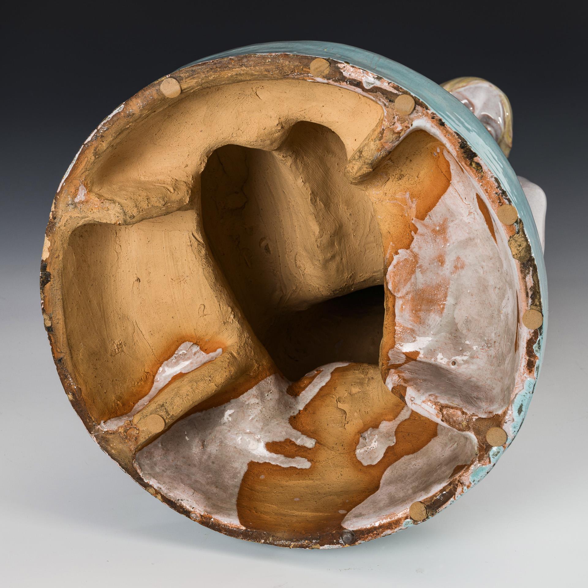 Roter Scherben, farbig staffiert und farblos bleiglasiert. H 43 cm. 5,8 kg.