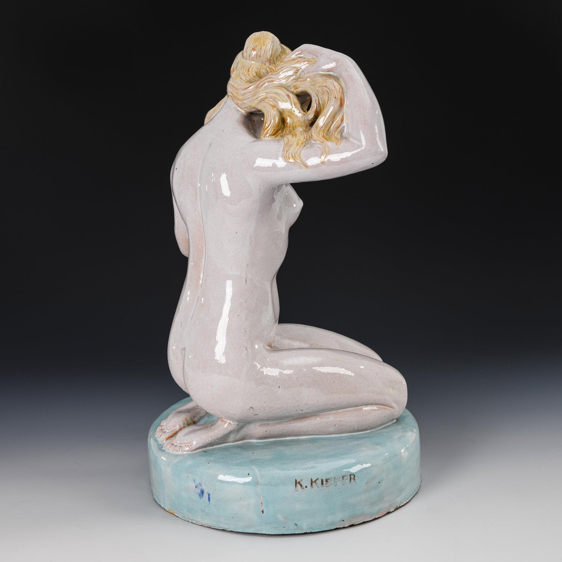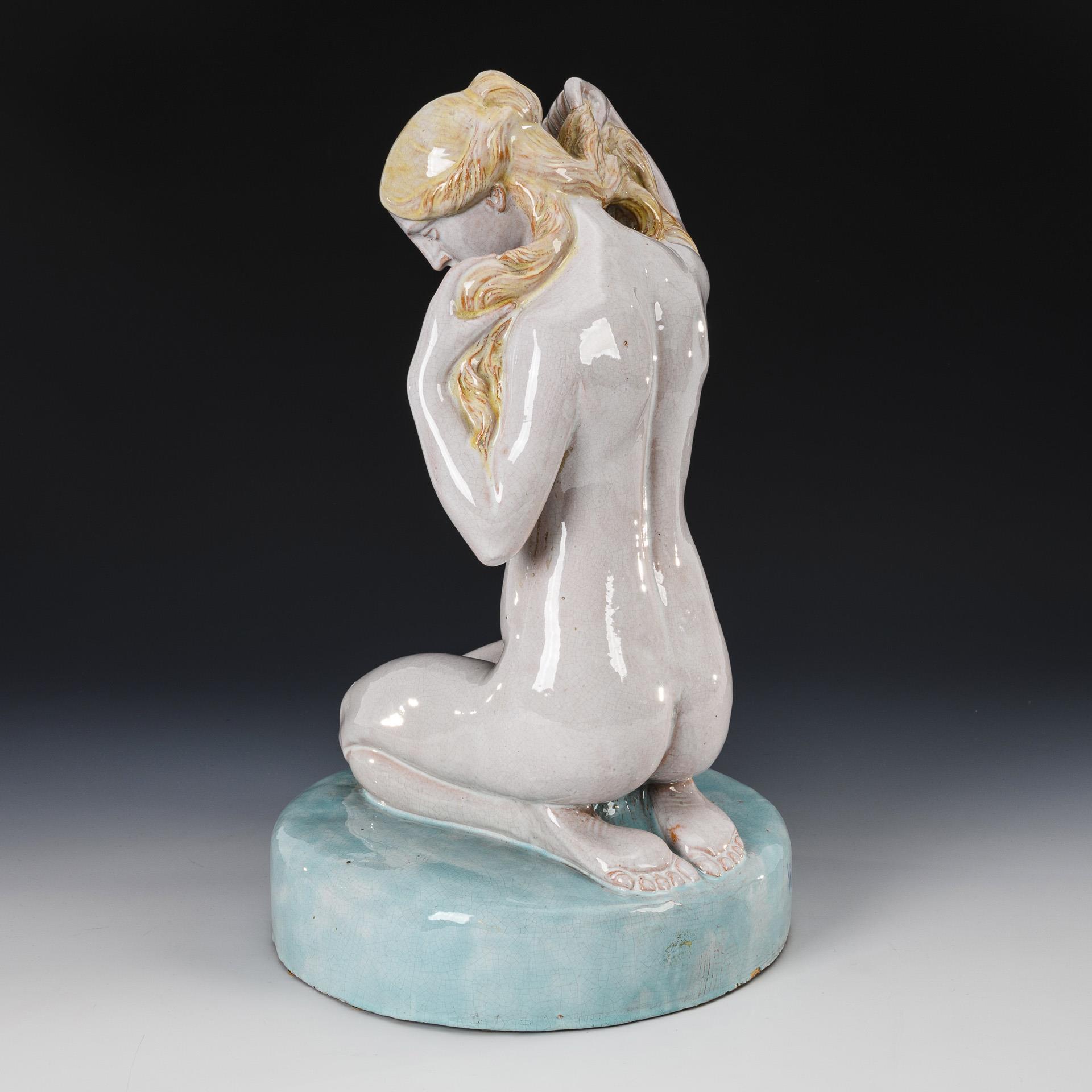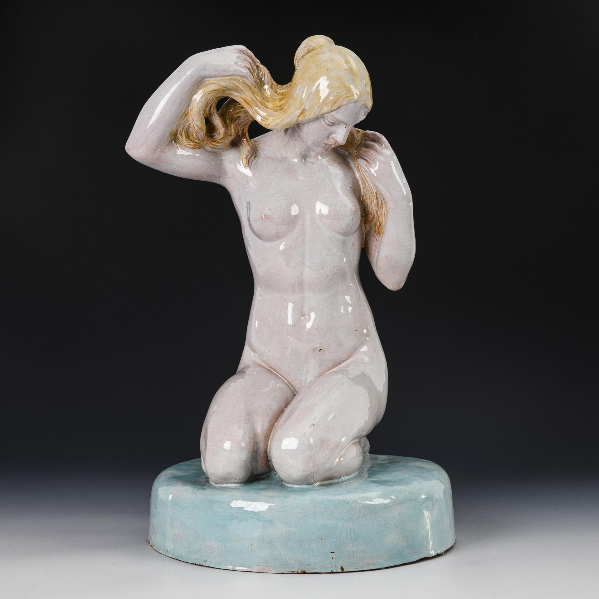Auf einem Rundsockel kniender Frauenakt beim Bade. Partiell minimal bestoßen.