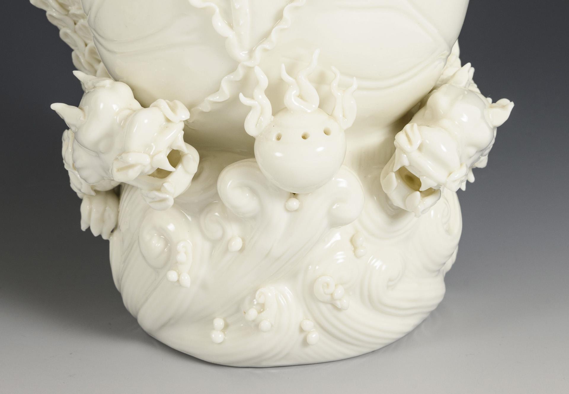 Durchscheinender Scherben mit weißer Glasur. Je zwei Drachen mit Feuerkugel und Lotusblüte als plastische Auflage auf der leicht reliefierten Wandung. Eine Vase mit wenigen, winzigen Chips.