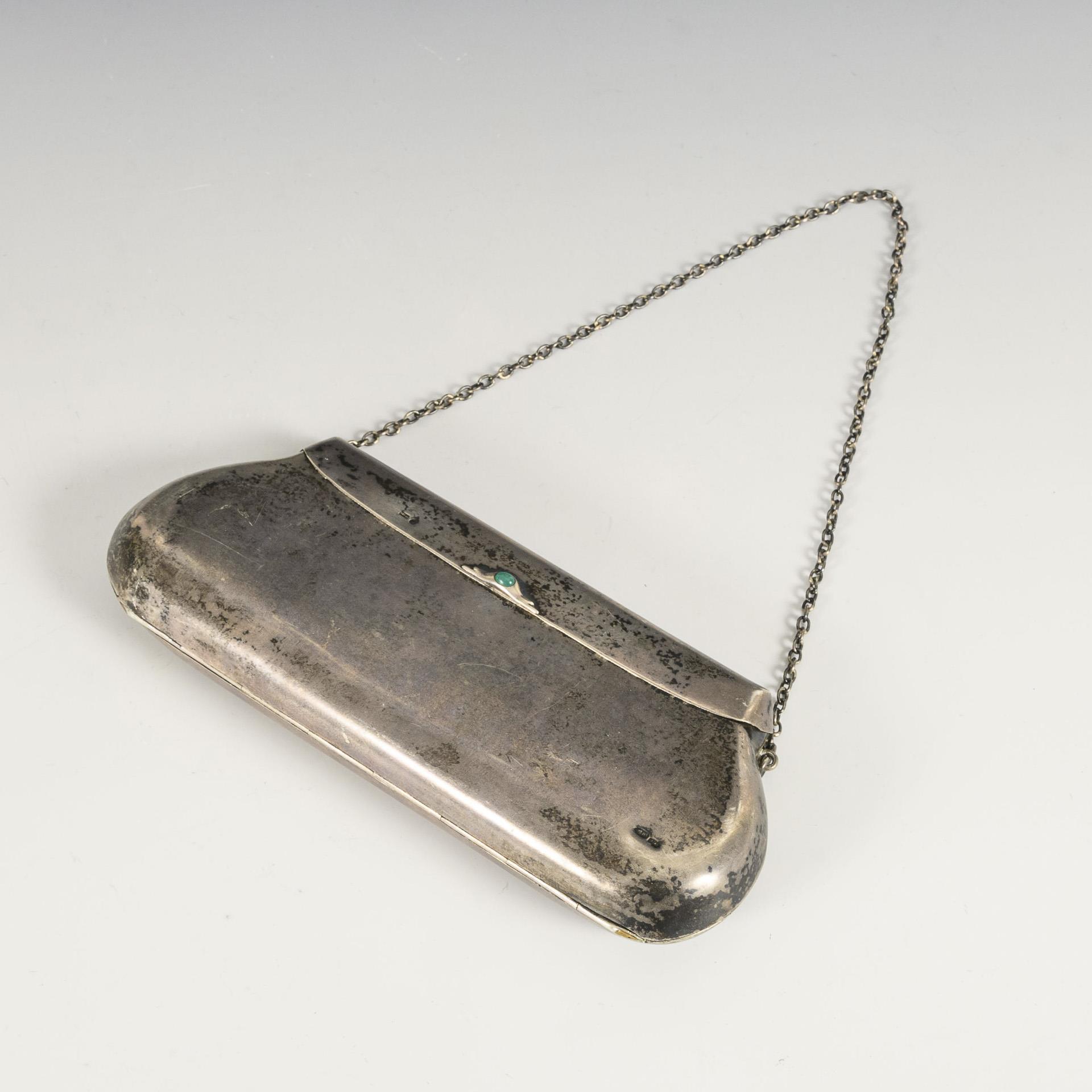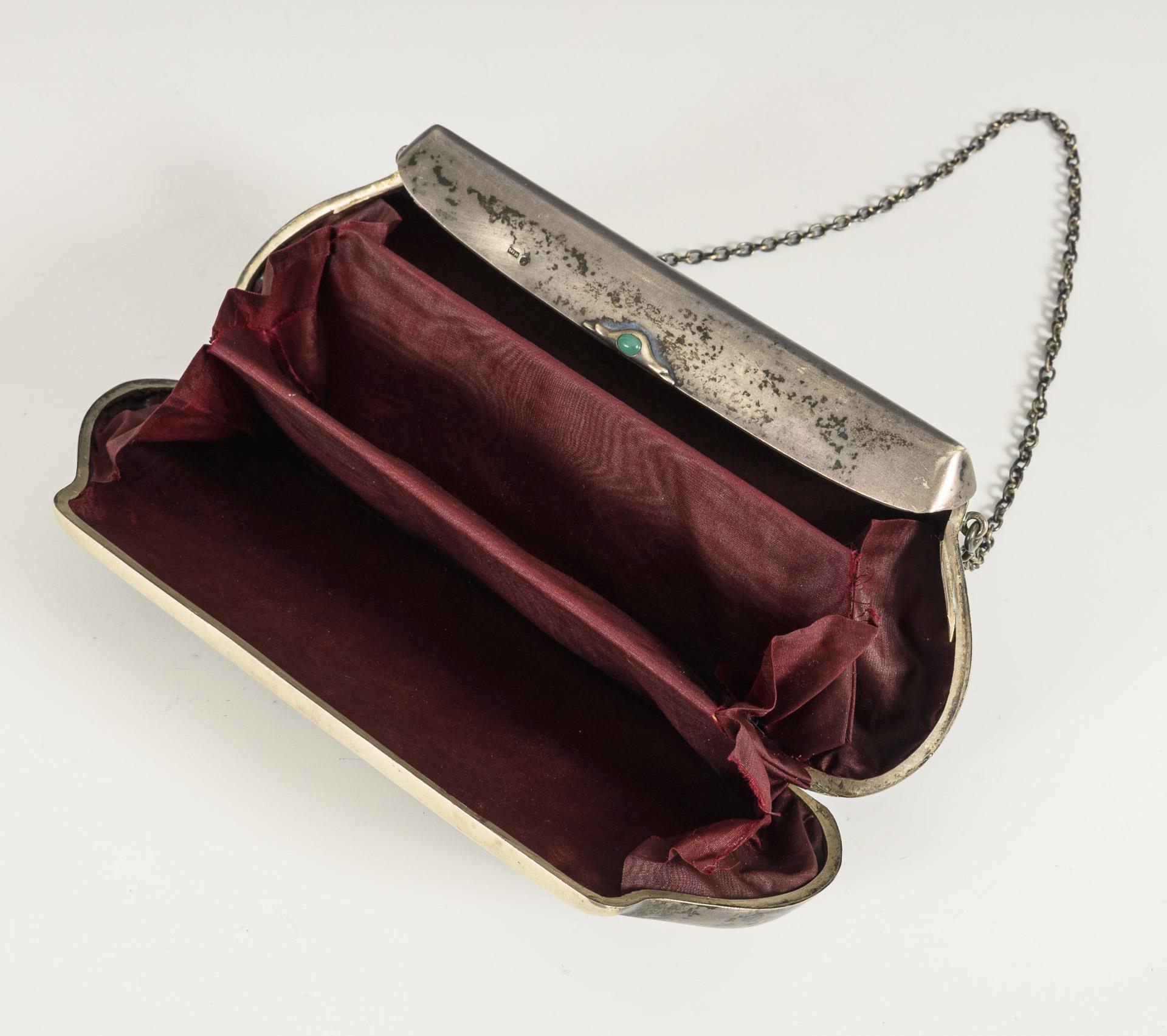 Schlichtes Täschchen mit Patentverschluss und Grünachat-Cabochon, an kurzer Kette. Dellen, innseitige Lötspuren am Verschluss.