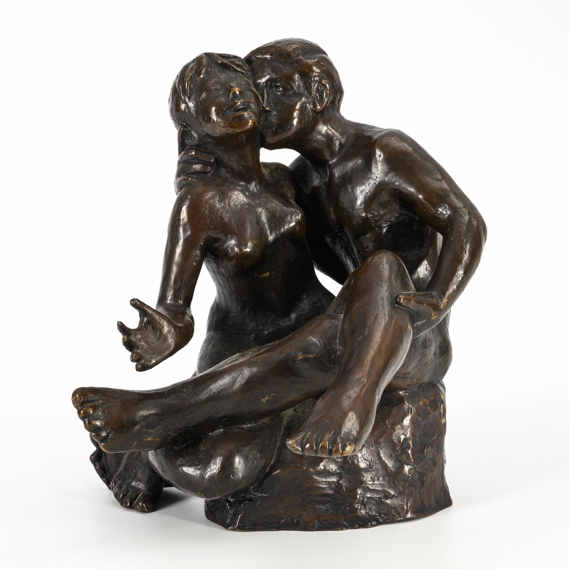 Auf einer Erhöhung sitzendes nacktes Paar in verschränkender Umarmung. Patina etwas berieben.
