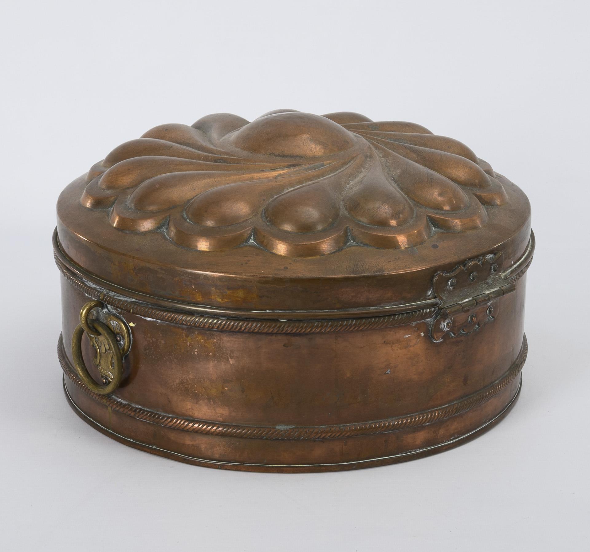 Kupfer teils geprägt, innen verzinnt, Messing. H 19 cm, Ø Behälter 35,5 cm.