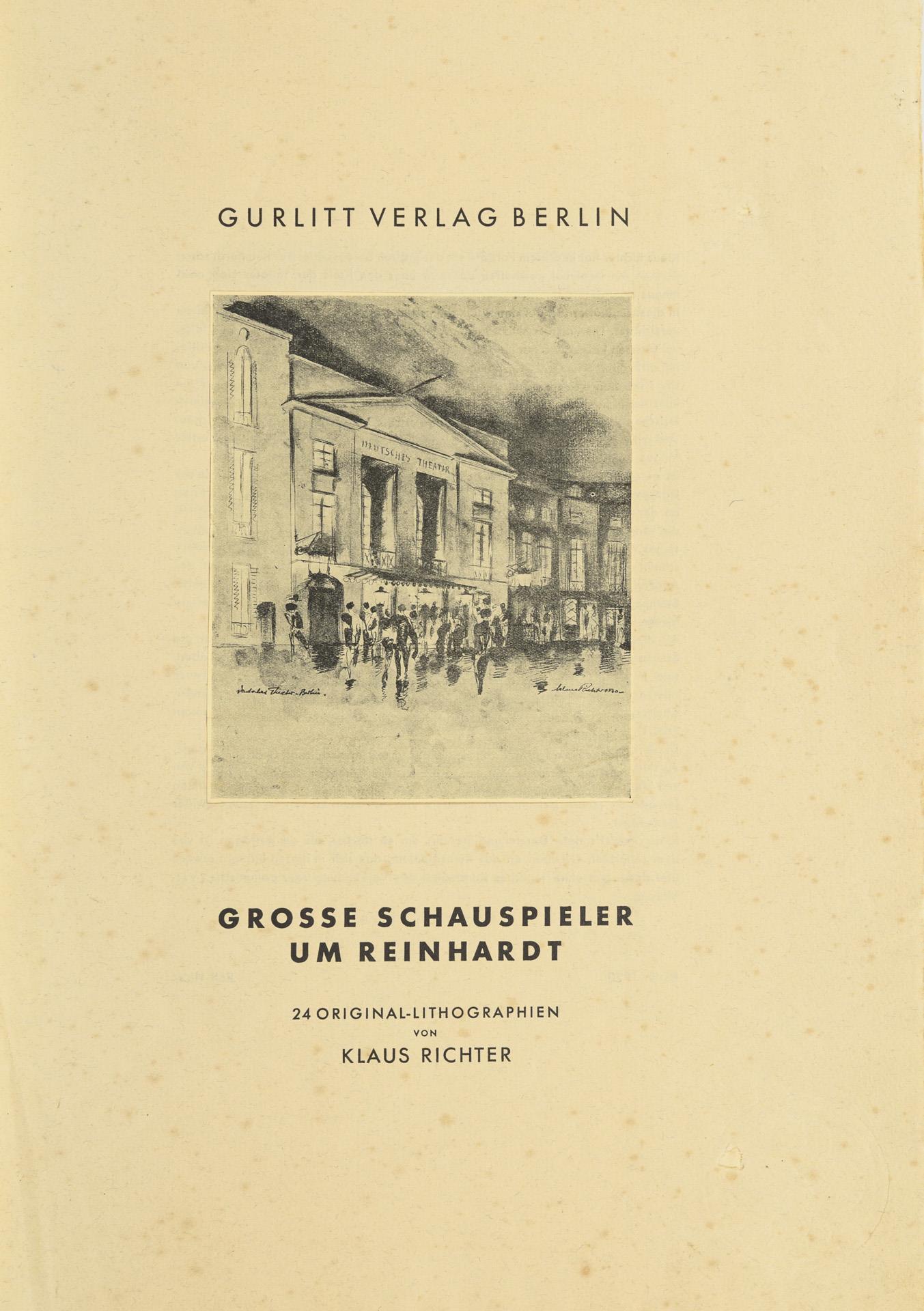 24 Originallithographien auf Japan-Papier. Nummerierte Mappe 23/100, jedes Blatt signiert und nummeriert, vollständig. Vorwort von Rolf Heise. Abbildungen: Deutsches Theater in Berlin-Mitte, Maria Bard, Leopoldine Konstantin, Lili Darvas, Tilla Durieux, Else Eckersberg, Gertrud Eysoldt, Rudolf Forster, Max Gülstorff, Paul Hartmann, Lucie Höflich, Friedrich Kayssler, Werner Krauss, Margo Lion, Hans Moser, Wladimir Sokolow, Helene Thimig, Jakob Tiedtke, Michael Tschechoff, Gustav Waldau, Hedwig Wangel, Hans Wassmann, Paul Wegener, Mathias Wiemann und Eduard von Winterstein. Mappenhülle mit stärkeren Alters- und Gebrauchsspuren. Beiblatt stockfleckig, Blatt mit Theaterdarstellung faltig. Sonst guter Zustand der Blätter.