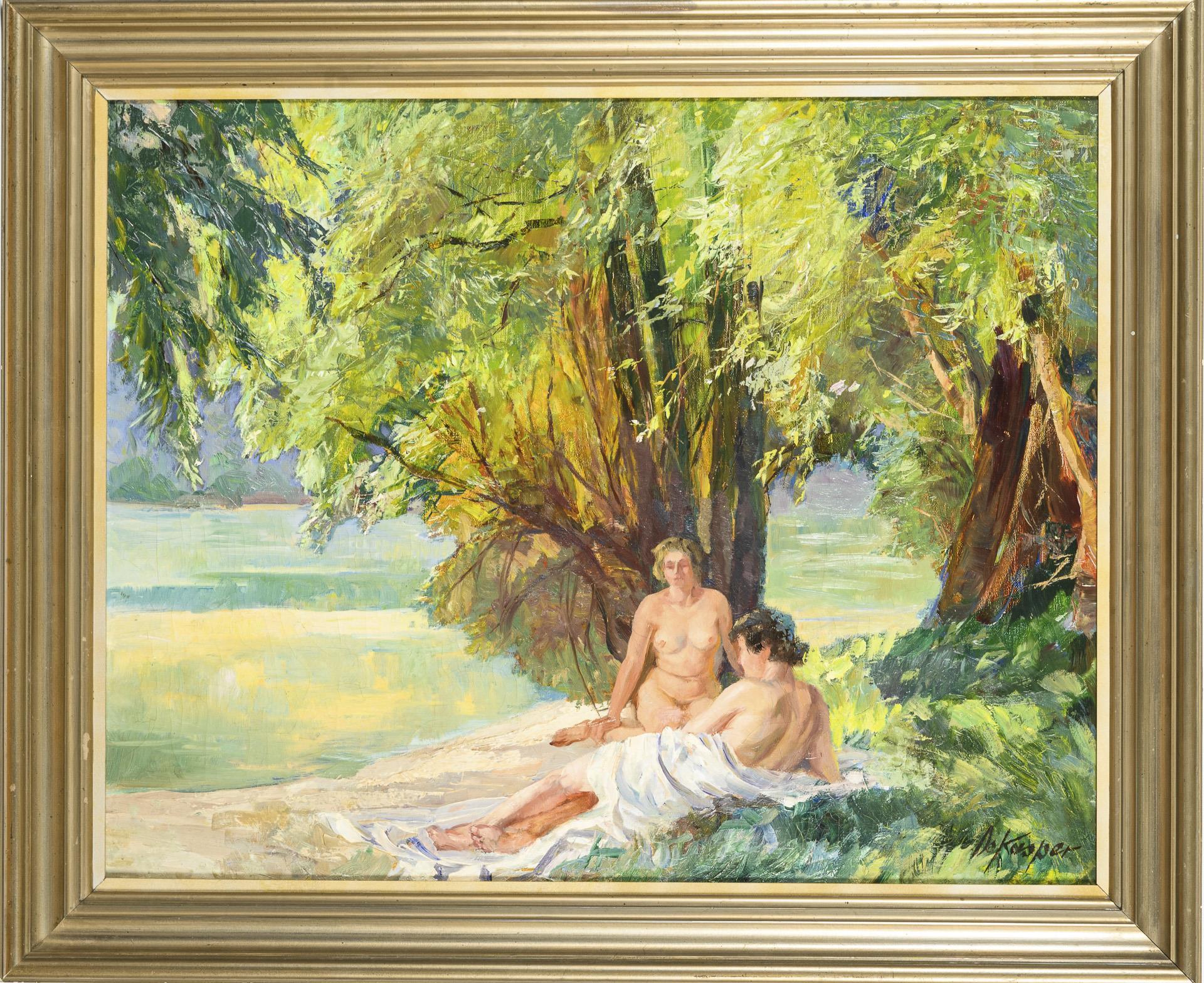 Zwei Frauenakte im Schatten der Bäume am Seeufer. Kleine restaurierte Stellen mit Hinterklebungen.