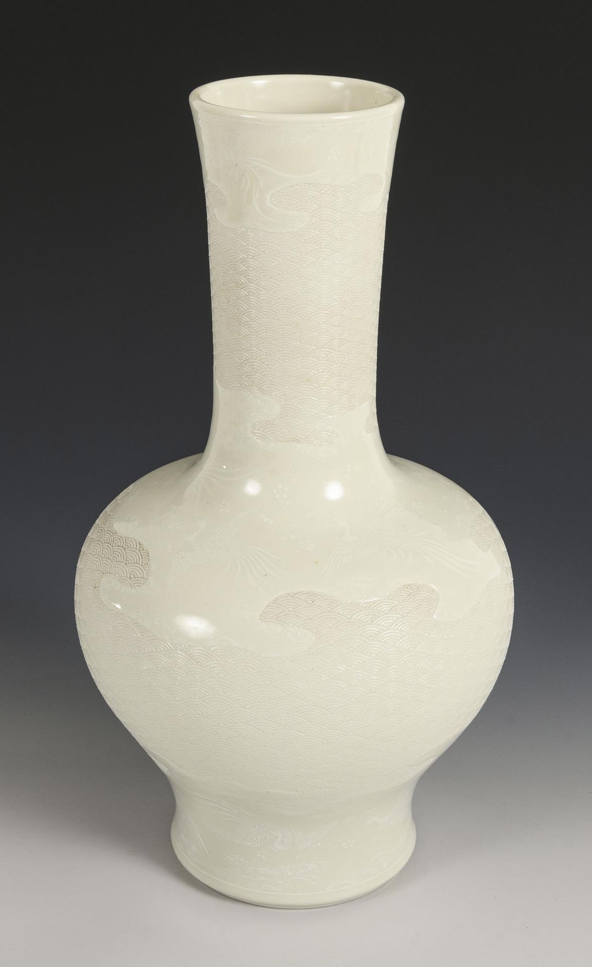 Qualitätvolle Balustervase mit feinem Wellendekor als Flachrelief und Phönixdarstellungen in der Glasur. Porzellan trotz kräftigen Scherbens durchscheinend.