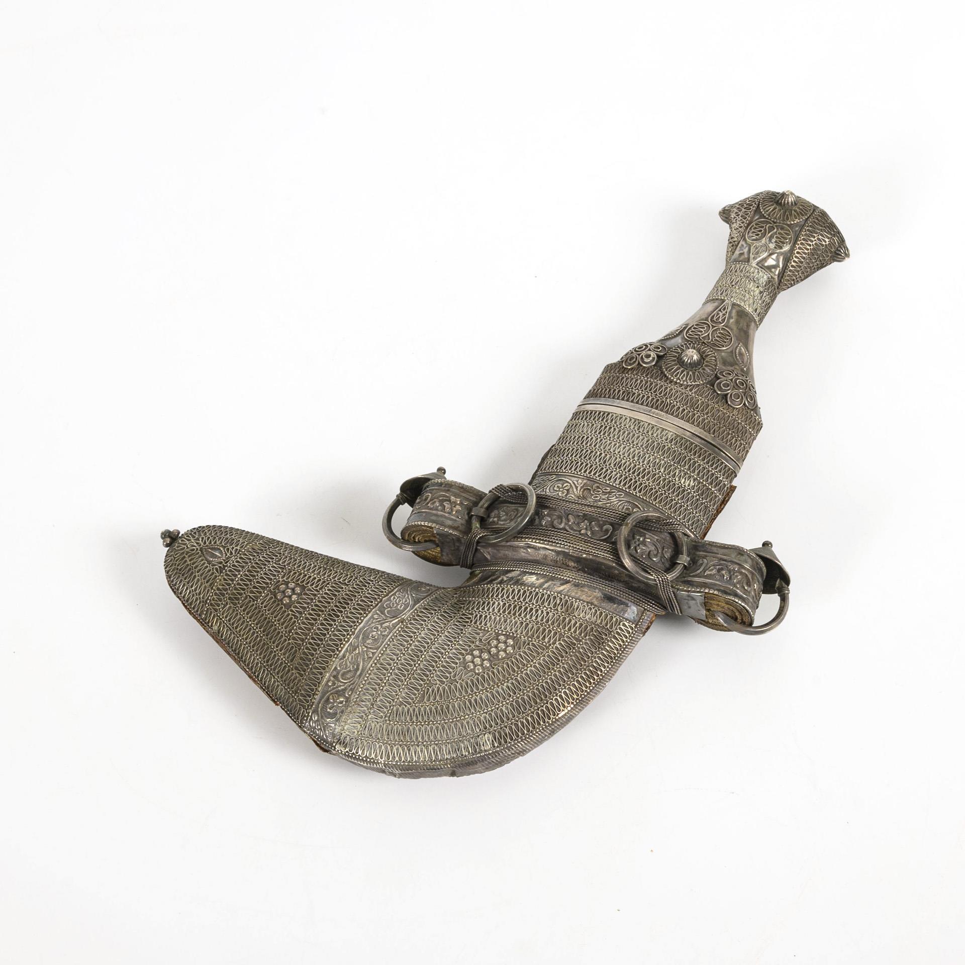 Dschambija mit breiter, zweischneidiger, gekrümmter Klinge mit Mittelgrat. Griff und Frontseite der Scheide aus Metall mit aufgelegten Verzierungen. Scheidenrückseite aus Leder.