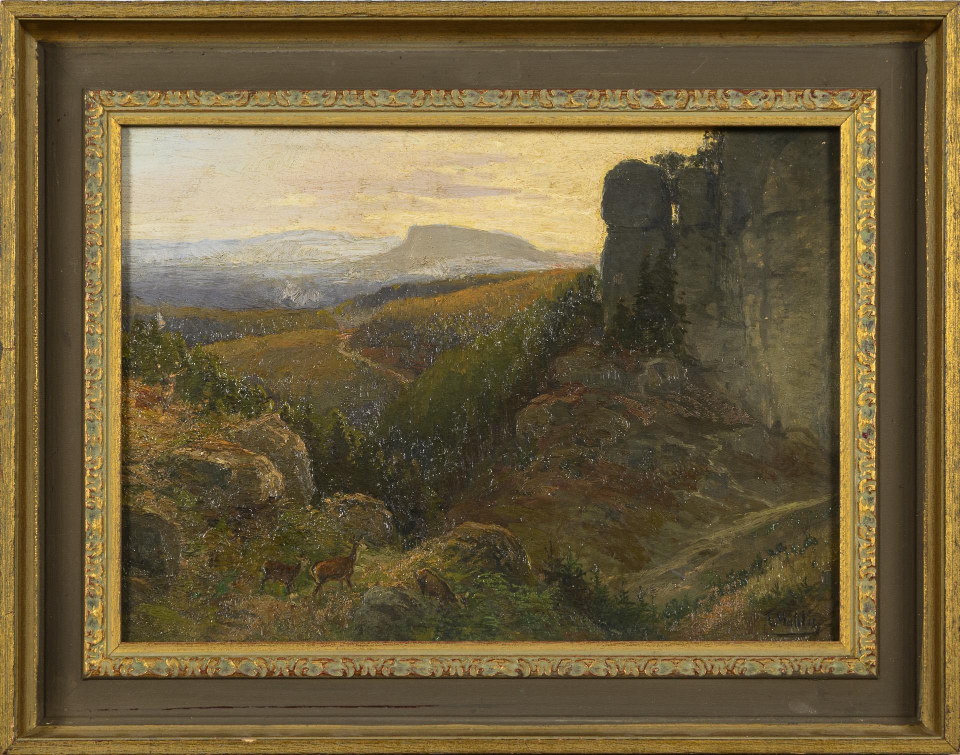 Motiv aus dem Heringsgrund-Schrammsteingebiet mit Rotwild nahe einer Klippe mit Blick über die weite Landschaft. Minimale Altersspuren.