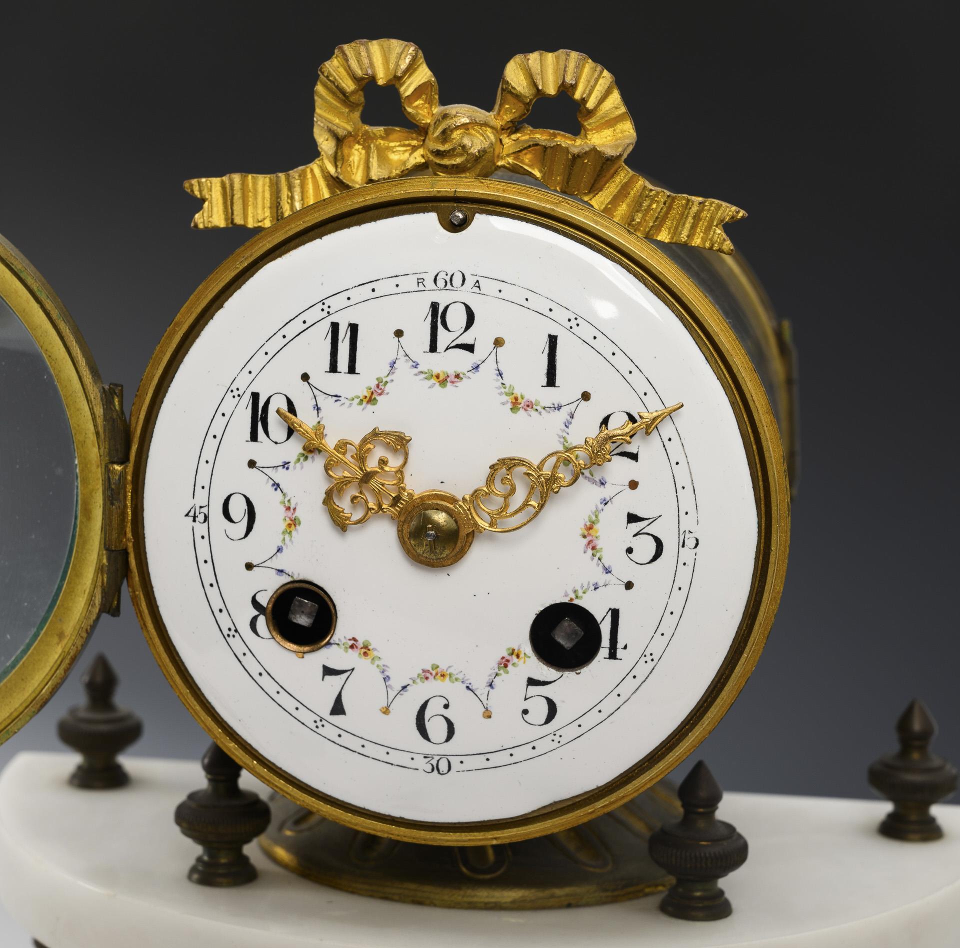 "L.P. Japy & Cie." gemarktes Werk mit Halbstundenschlag auf Glocke. Im Kurzzeittest funktionstüchtig. Weißes Emailzifferblatt mit arabischen Zahlen, Minuterie mit farbigen Festons und Louis XV-Zeigern.