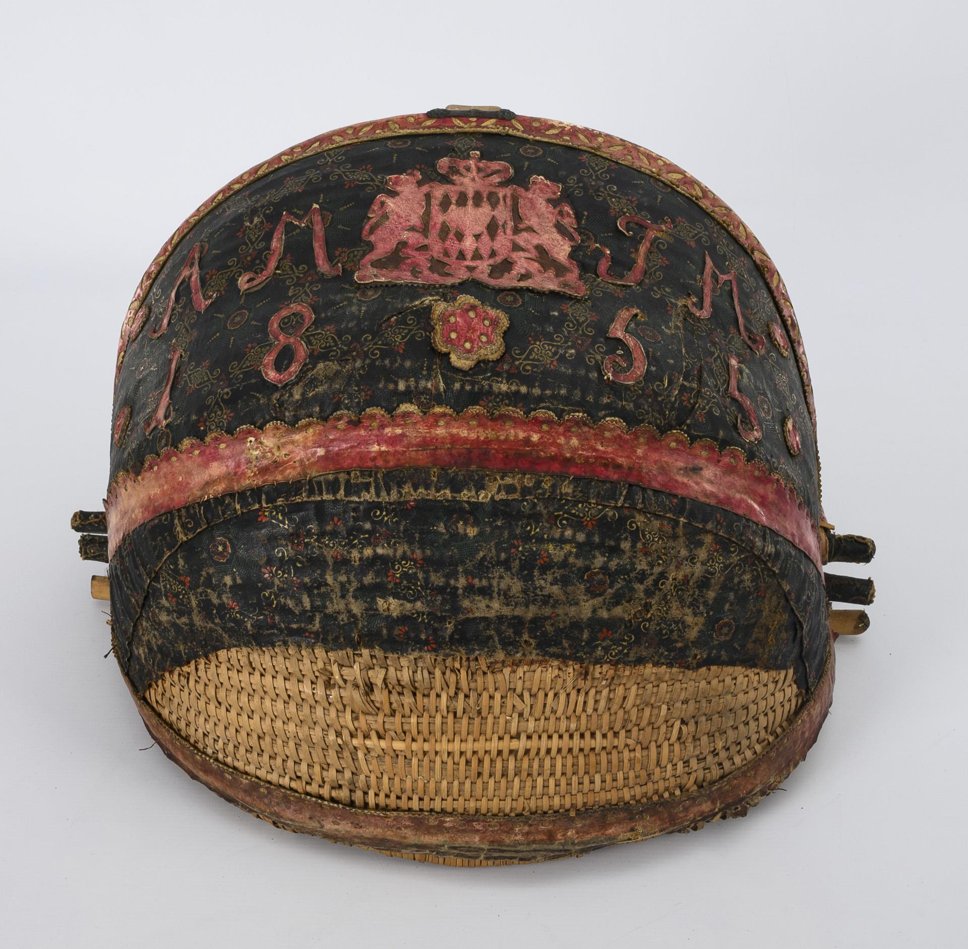 Annähernd viertelkugeliger Korpus mit Scharnierdeckel und Tragehenkel. Stoffbezug an der Frontwandung und auf dem Deckel mit feinem Ornament über dunkelgrünem Grund sowie einige Appliken: Herz, Blumen, Rosetten. Wappen mit den Monogrammen "AM JM" und Datum "1855". Starke Alters-/Gebrauchsspuren (Fehlstellen am Bezug, Anobienspuren), Stoffbezug innen wohl jünger ergänzt.