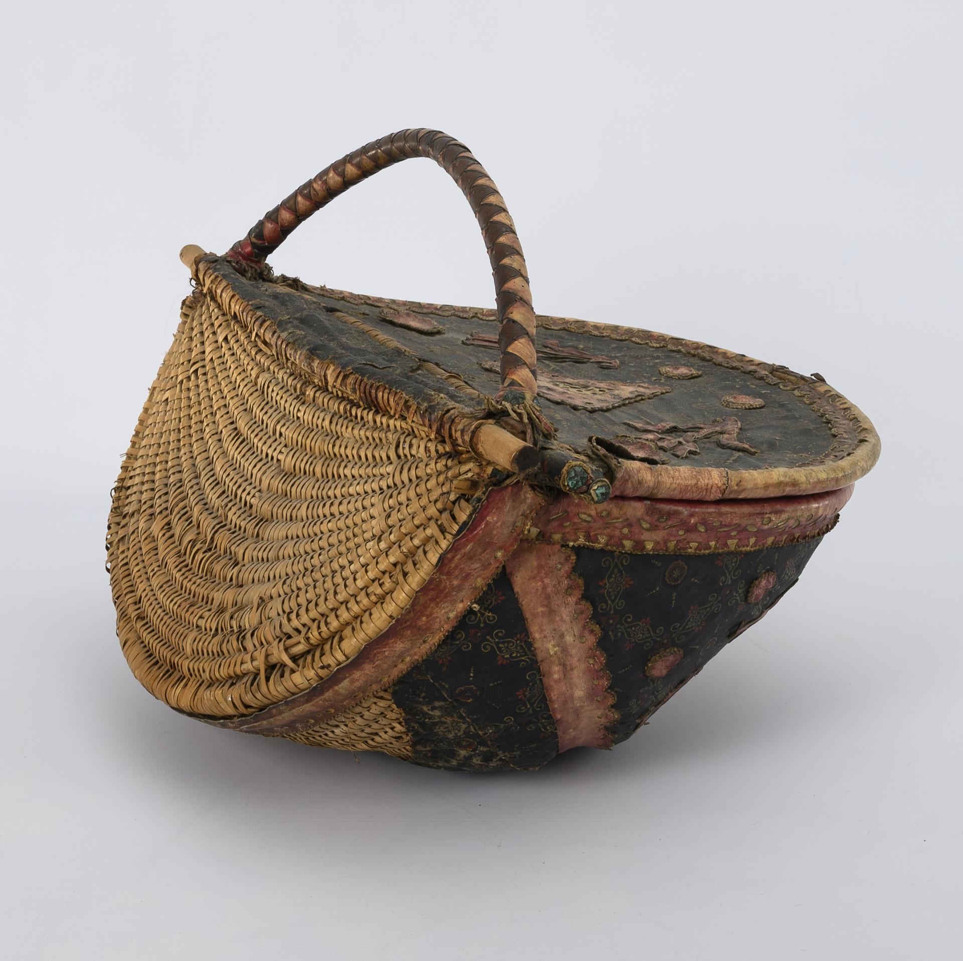 Korbgeflecht, bedruckter Stoffbezug mit teils mehrschichtigen Appliken aus Karton mit Farblithografien, innen Stoffbezug. 22 x 47 x 31 cm (ohne Henkel).