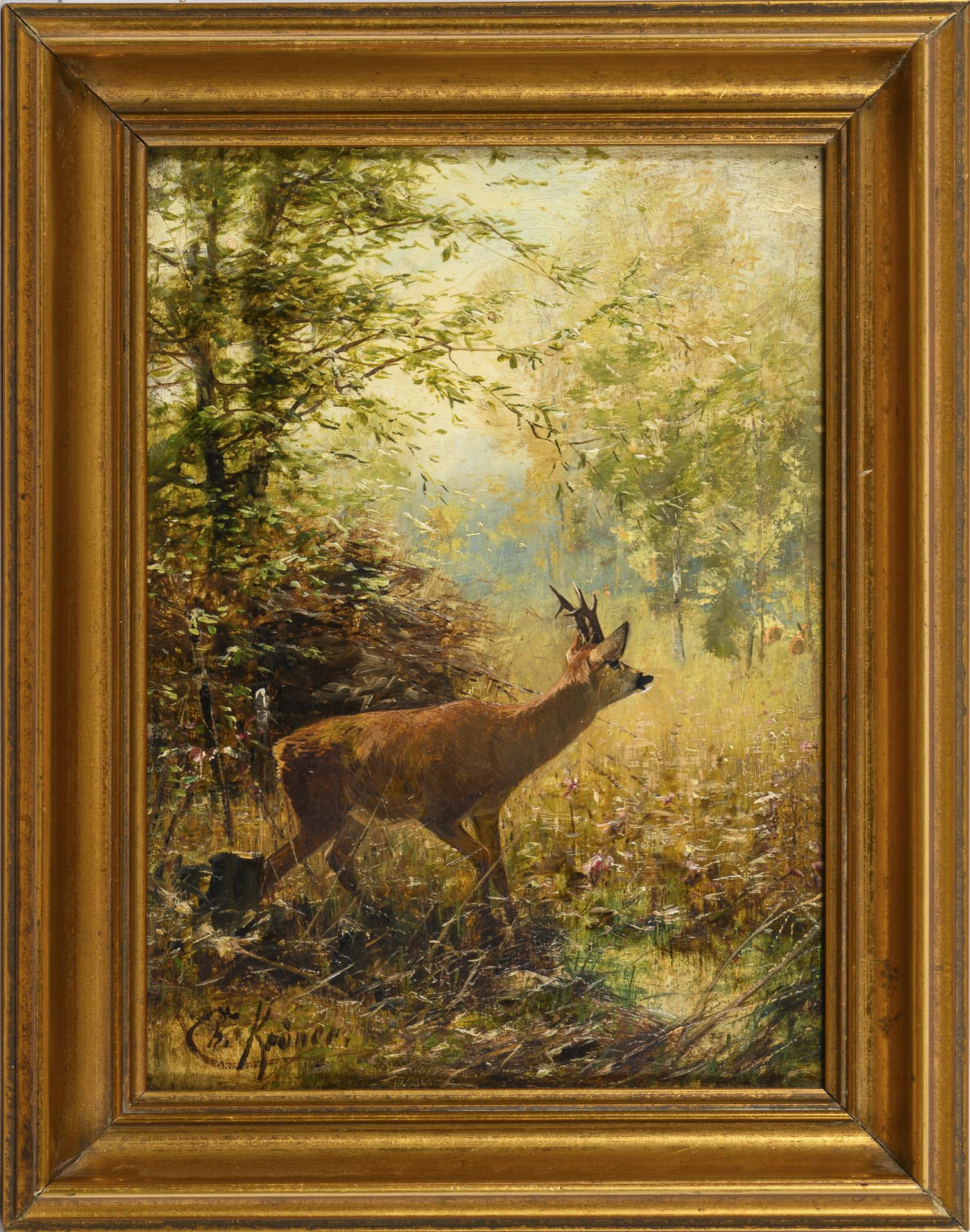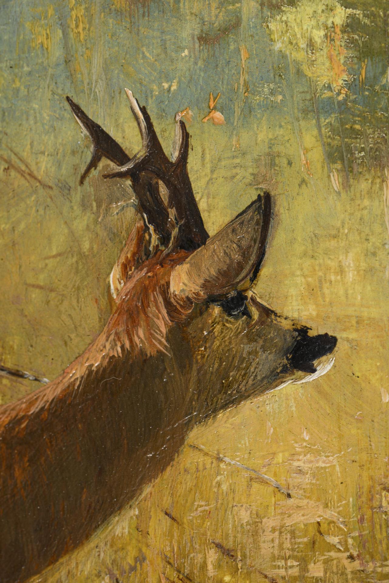 Das Tier beim vorsichtigen Verlassen der schützenden Bäume an einem sonnigen Tag. Siehe auch Kat.-Nr. 457 Konvolut des Malers mit dessen Totenmaske. Retuschiert.