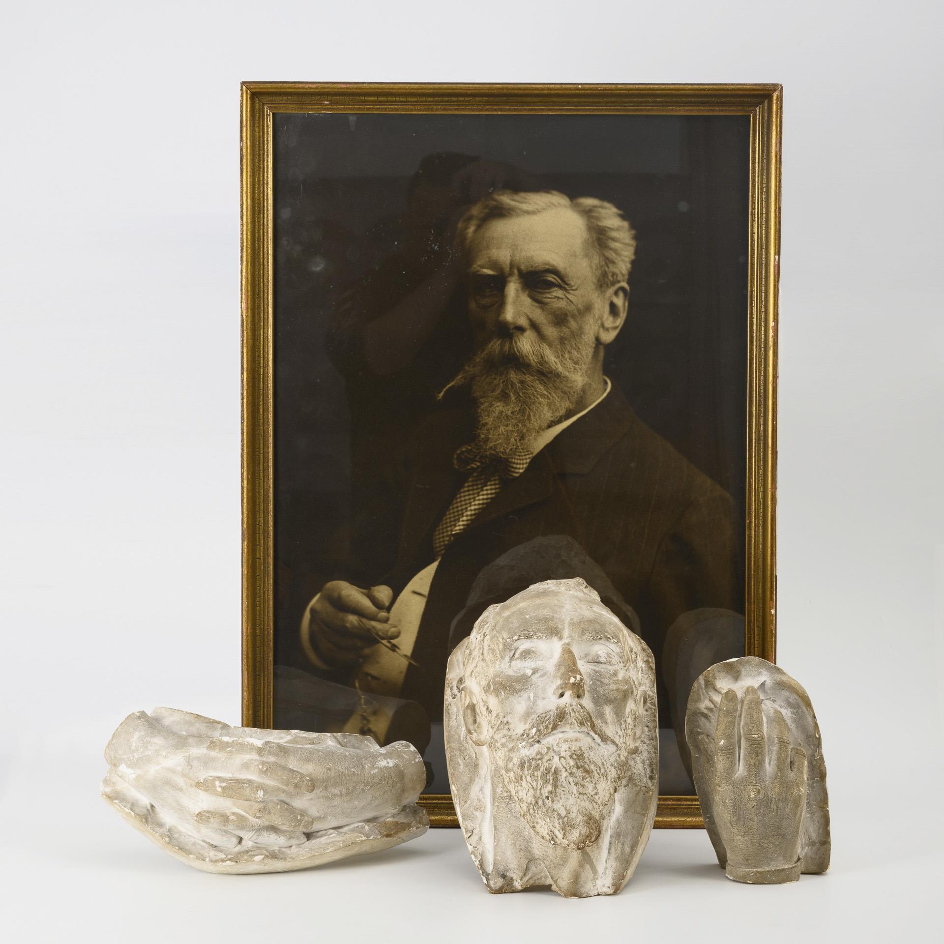 Sehr große Fotografie mit dem Hüftbildnis sowie Totenmaske, die gefalteten Hände und die rechte Hand des Malers. Totenmaske und gefaltete Hände geklebt, je Alters-/Gebrauchsspuren auch am Rahmen.