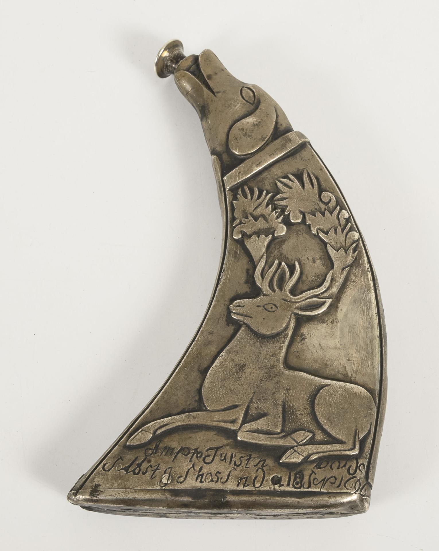 Beidseitig mit lagerndem Hirsch nach Ridinger reliefierte Pulverflasche; die Mündung in Form eines Hundekopfes sowie Metallknauf am Holzstöpsel. Beidseitig "Gravur" mit Ortsangabe Preußen und Datum "18. Sep. 1696". Einige Alters-/Gebrauchsspuren, kleine Bleireparatur.